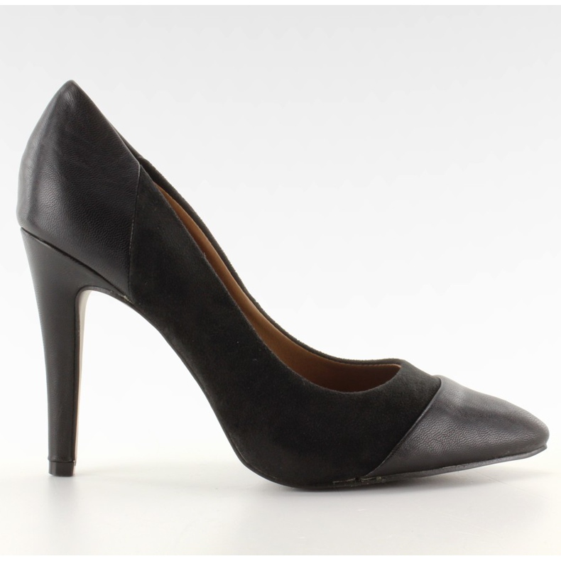 Klasické vysoké podpatky E364 - elegantní lodičky v nadčasové černé barvě, kombinující dvě povrchové úpravy: jemný ekologický semiš a hladkou, ekologickou lícovou kůži. Štíhlá špičatá špička a vysoké jehlové boty (11 cm) zeštíhlují postavu a dodávají tomuto stylu elegantní vzhled – ideální jak pro večerní výlety, tak pro zdůraznění každodenního elegantního vzhledu.