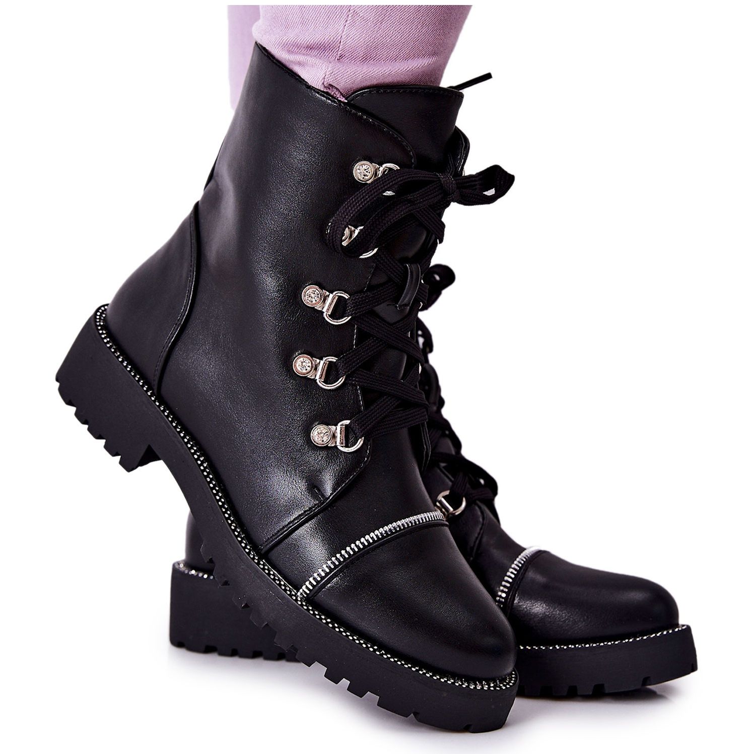 Kozačky jsou vybaveny praktickým zavazováním a zipem, který usnadňuje nazouvání a zajišťuje dokonalé přizpůsobení noze. Další výhodou je ozdobný zip vpředu, který botám dodává jedinečný charakter. Na podrážce jsou jemné kamínky, které dodávají celku lehkost a eleganci.