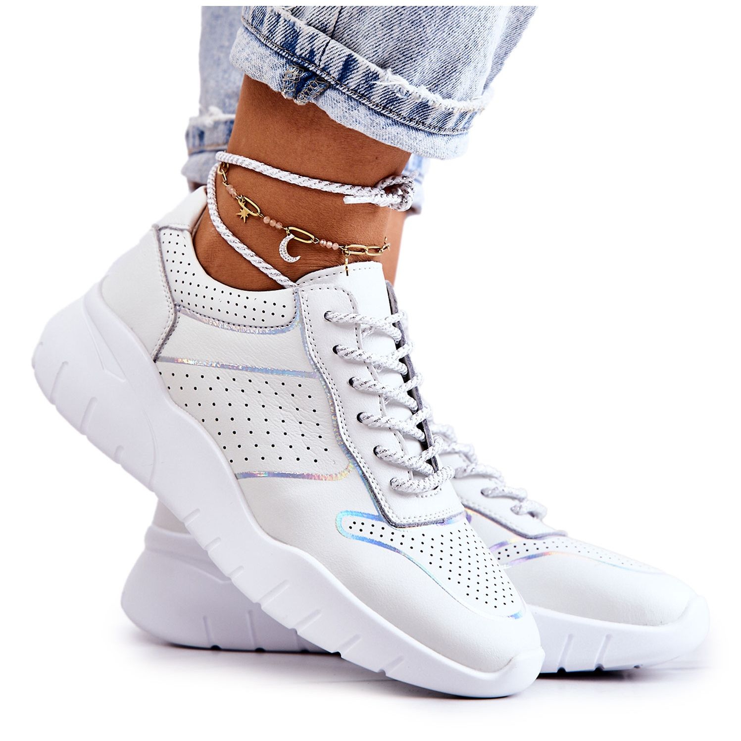 S. Barski Carly - Klasické bílé tenisky v bílé, kombinující sportovní pohodlí s jemným, módním povrchem. Vyrobeno z přírodní, perforované kůže, poskytují dobrou drenáž vzduchu a elegantní vzhled. Měkká vložka přírodní kůže zaručuje pohodlí po celý den a mírně protáhlý kulatý nos a šněrování pro kulaté tkaniny zdůrazňuje jejich univerzální charakter. Holografické vložky na horní část přidávají moderní přízvuk.