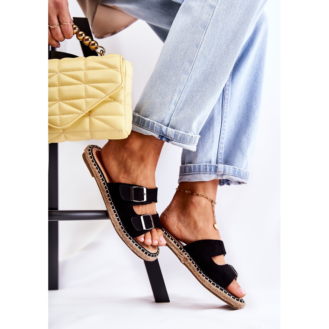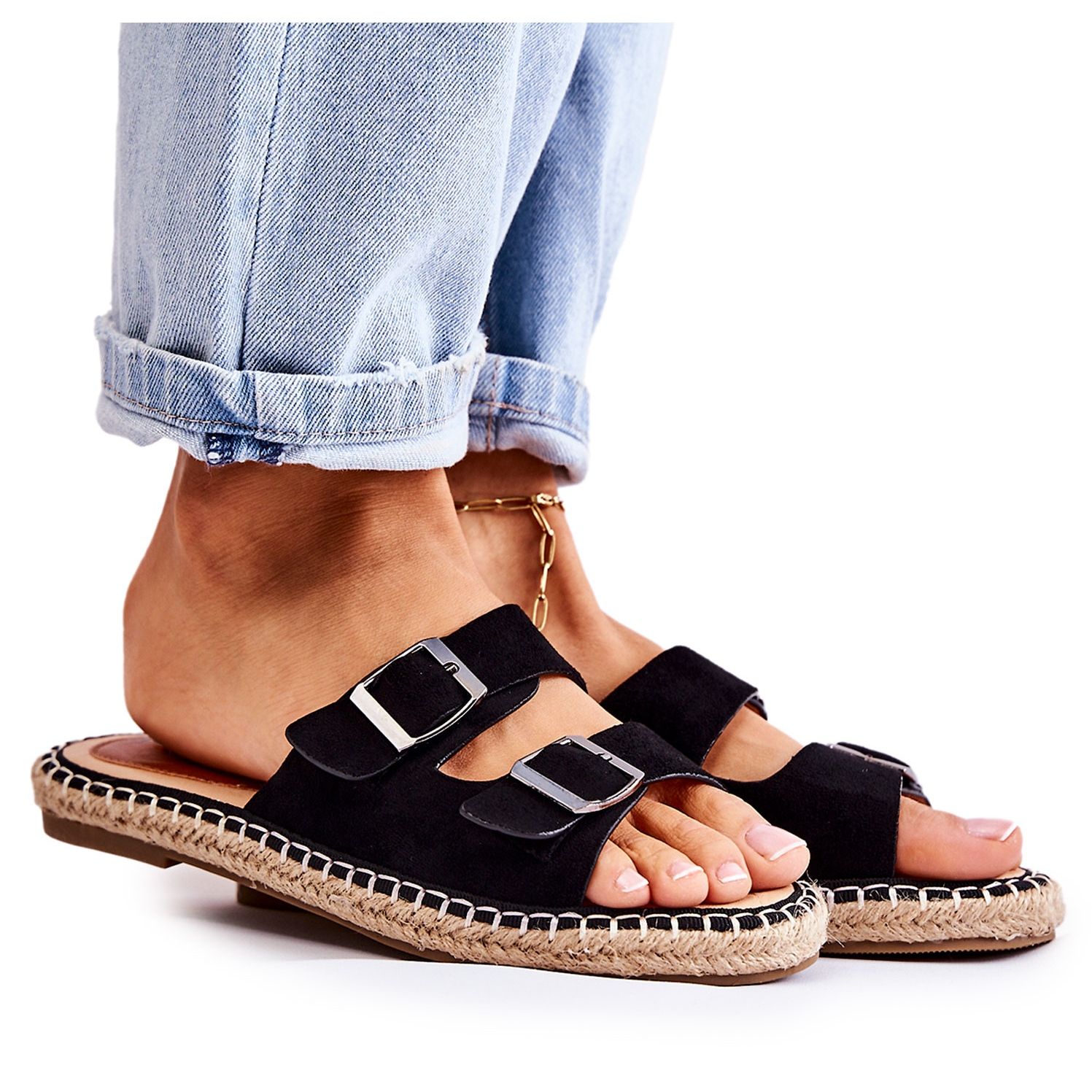 Žabky jsou nasazeny na plochém podpatku vysokém 2,5 cm a mají protiskluzovou podrážku, která zajistí pohodlí i při delších procházkách. Dva nastavitelné pásky s přezkou umožňují dokonalé přizpůsobení obuvi k noze, což zvyšuje komfort používání. Kolem podrážky je navíc ozdobný jutový cop, který dodává žabkám módní a stylový vzhled.