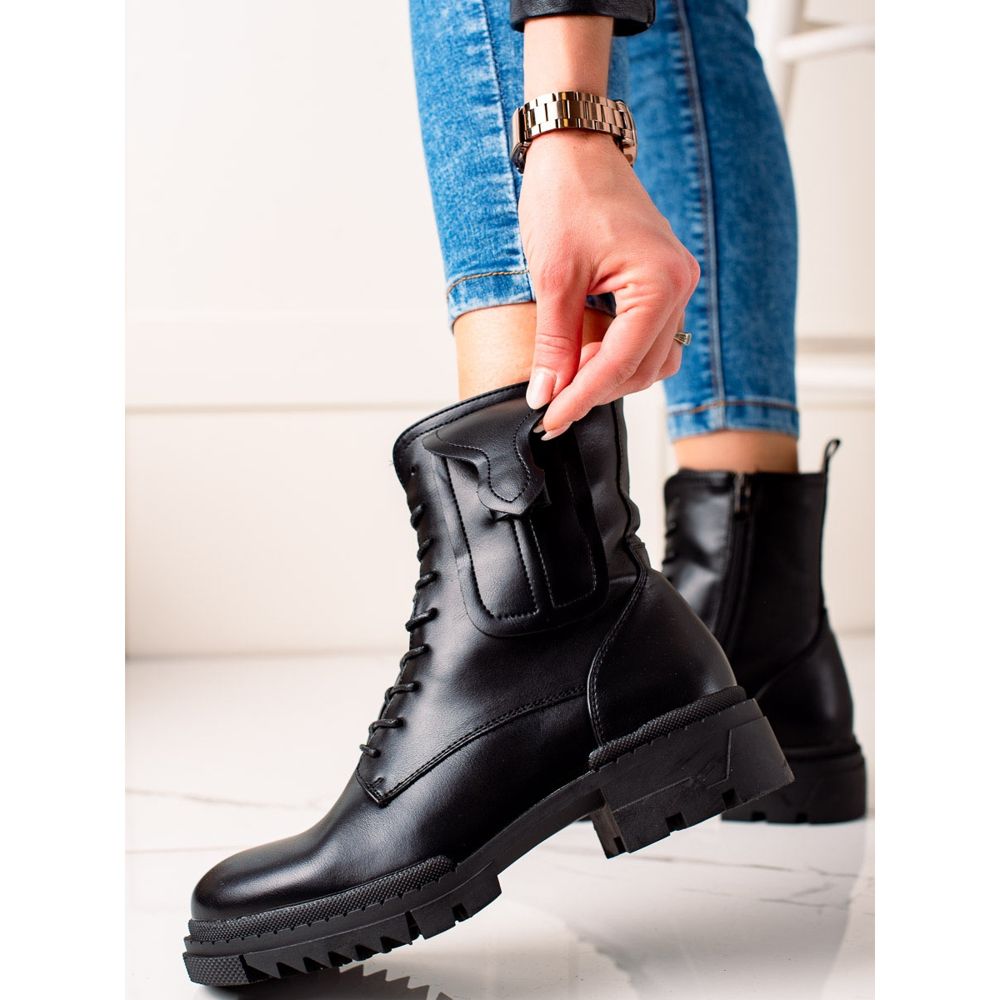 Klasické šněrovací kotníkové boty W. Potocki jsou perfektní volbou pro ženy, které si cení stylu a pohodlí. Tyto černé kotníkové boty vyrobené z ekokůže vypadají elegantně a jsou ideální pro chladné dny. Vestavěný měkký podpatek zajišťuje pohodlí při nošení a 4,5 cm vysoký podpatek a 2,5 cm vysoká platforma dodají jemné kouzlo každému stylingu.