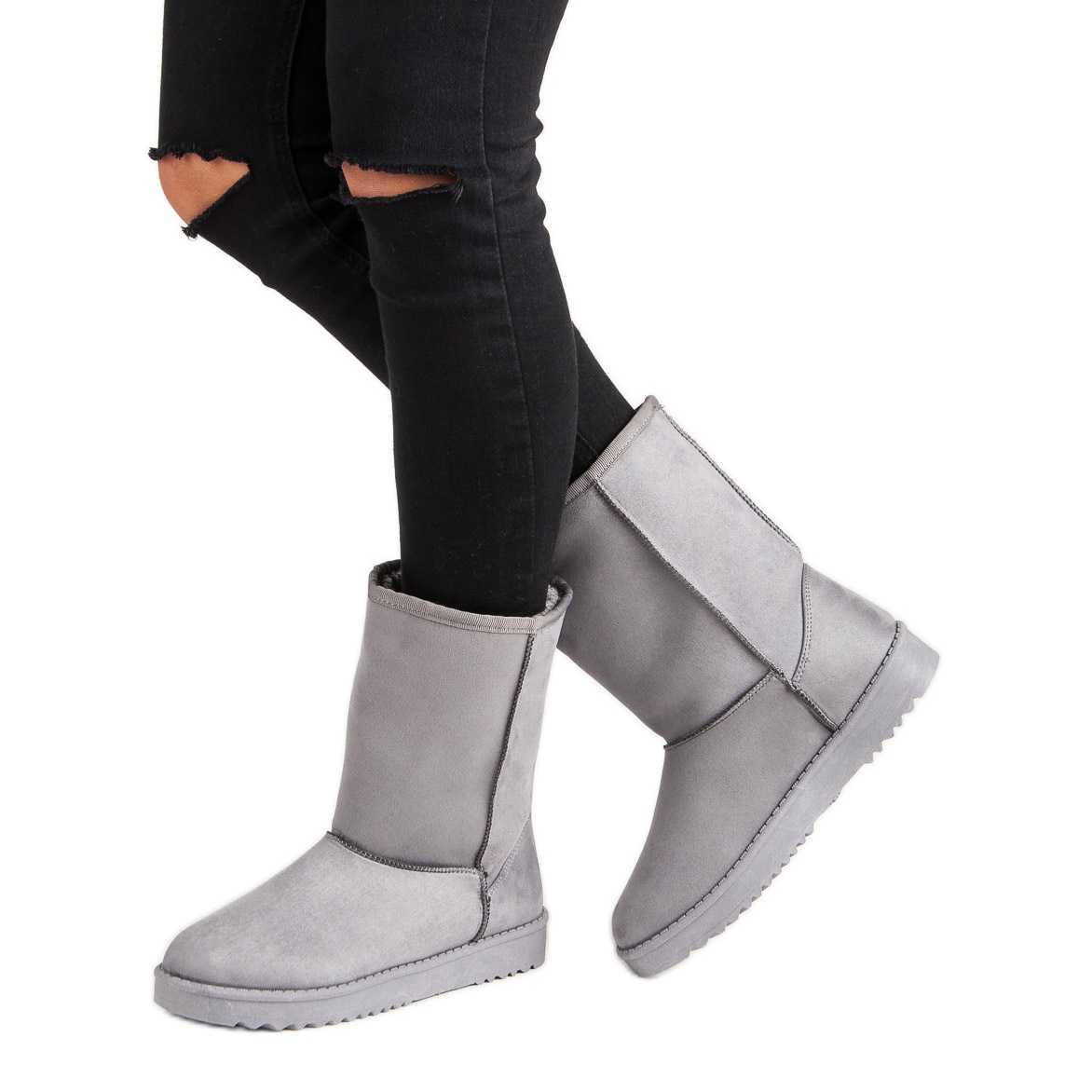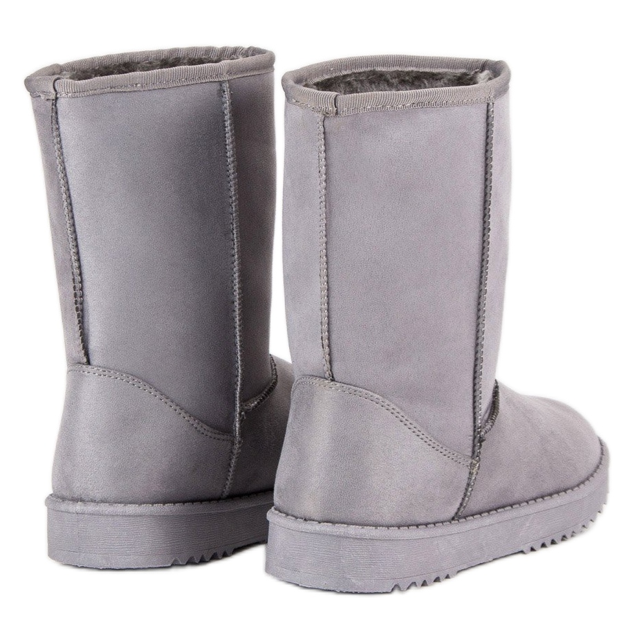 Toto je perfektní volba pro chladné dny - klasické mukluky v elegantním šedém odstínu, které skvěle doplní každý zimní styling. Tyto dámské boty vyrobené z ekologického semiše kombinují módní design s funkčností. Jejich slip-on design a svršek sahající nad kotníky poskytuje nejen pohodlí, ale také skvělou ochranu před chladem.