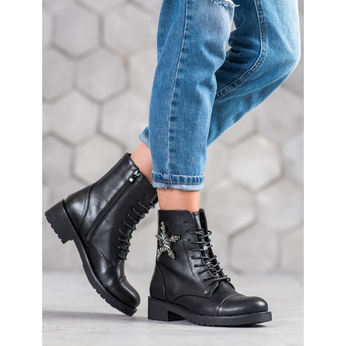 Elegantní akcent v podobě ozdobných krystalů dává modelu vyniknout ostatním. Díky jejich univerzální černé barvě se dělnické boty snadno kombinují s různými outfity, od ležérních až po rockové. Díky plochému 4 cm vysokému podpatku boty poskytují optimální pohodlí při používání.