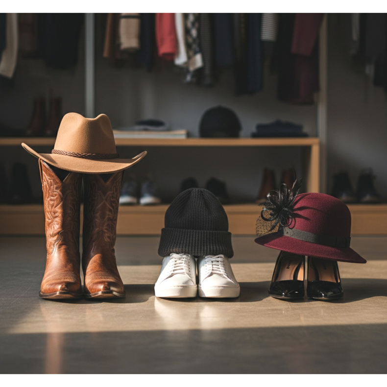 Styl klobouků a bot by se měl shodovat. Pokud nosíte kovbojské boty, přirozenou volbou bude kovbojský klobouk. Pokud nosíte minimalistické tenisky, bude se hodit jednoduchá kšiltovka nebo kulich. Pokud nosíte elegantní vysoké podpatky, budou vhodné klobouky jako fascinátory nebo cloche. Míchání stylů může vést k nekompatibilnímu vzhledu – pokud to neuděláte záměrně, abyste vytvořili módní kontrast.