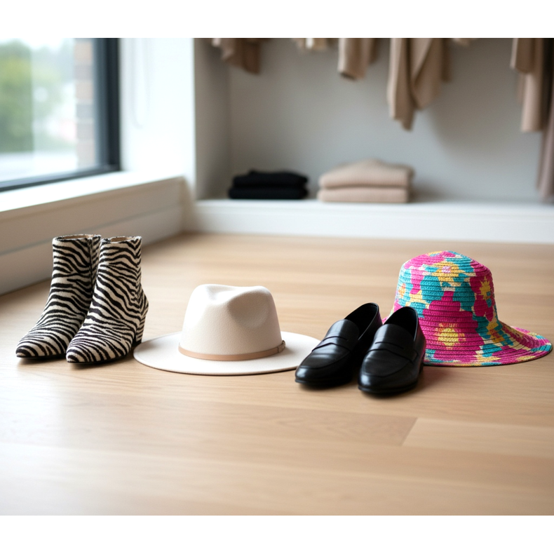 Někdy je nejlepší přeskočit přesnou shodu a hrát si s komplementaritou. Pokud například nosíte zvířecí boty s potiskem, může vám stačit monochromatický klobouk v neutrální barvě. Nebo naopak – neutrální boty a odvážný, barevný klobouk. To vytváří vizuální zájem, aniž by byl příliš chaotický.