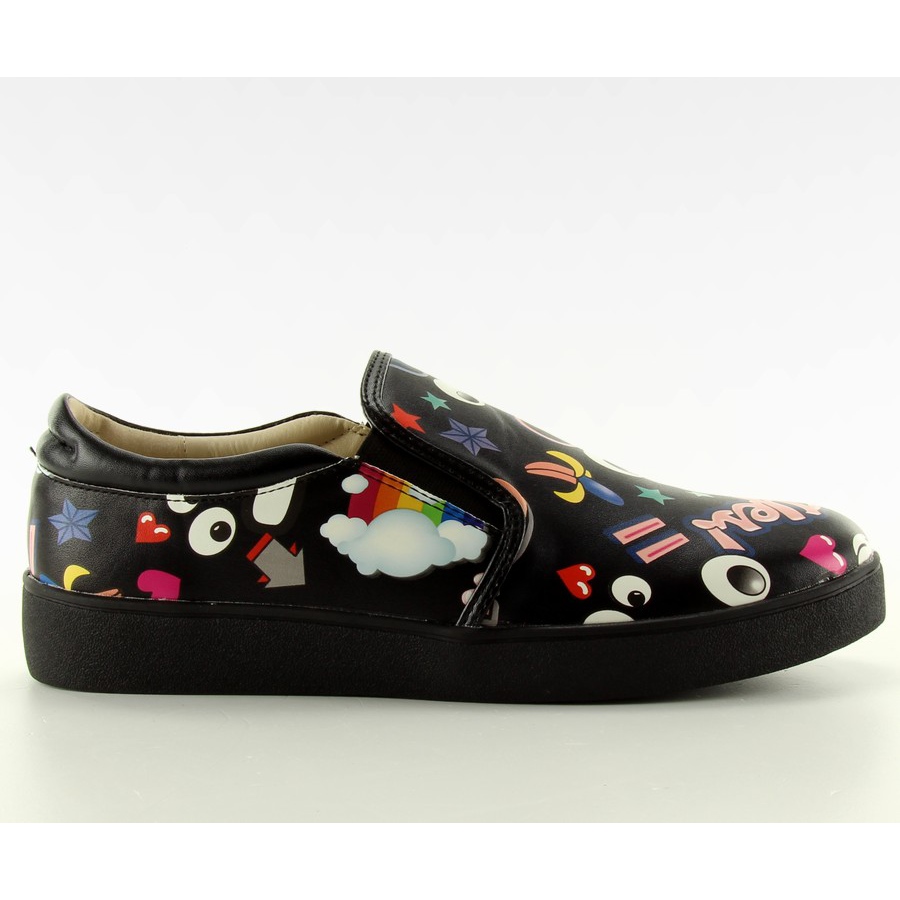 Comic Slipons 6120 Black – vyberte si styl, který přitahuje pozornost. Černý styl s barevným komiksovým potiskem je návrhem pro ženy, které se rády vyjadřují prostřednictvím módy. Klasické nízké nazouvací tenisky kombinují pohodlí s originálním designem – ideální pro každodenní styling i městská dobrodružství.
