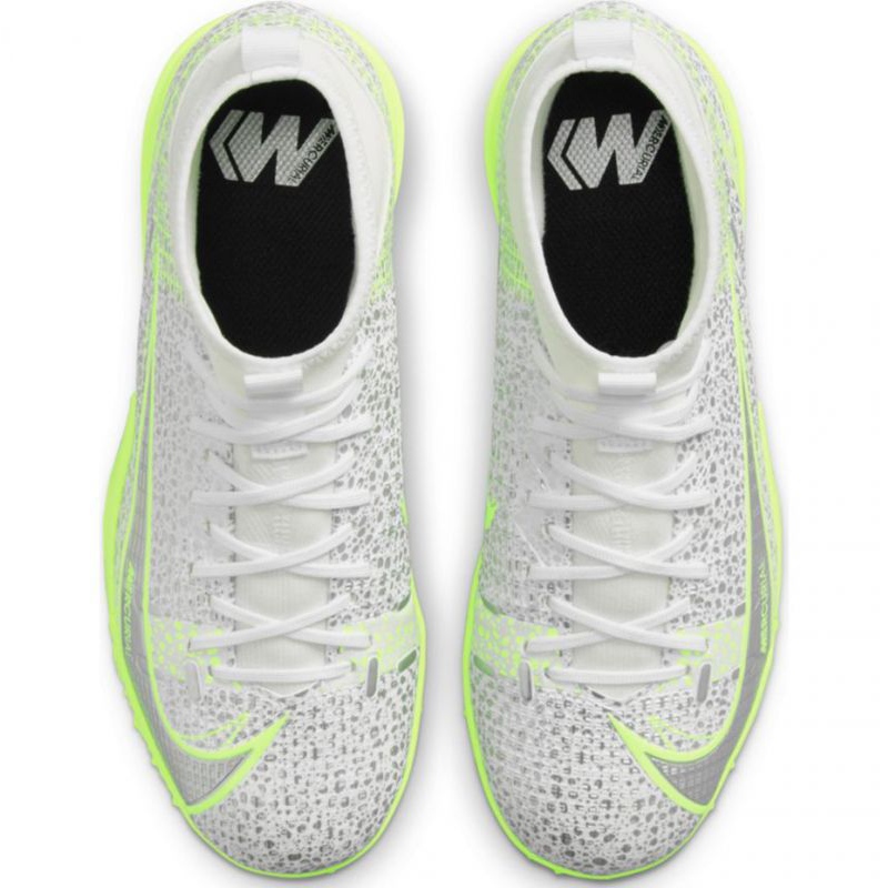 Šedá a stříbrná barva bot Nike Mercurial Superfly 8 Academy TF Jr nejen skvěle vypadá na hřišti, ale také dává mladým hráčům vyniknout v jakémkoli týmu.