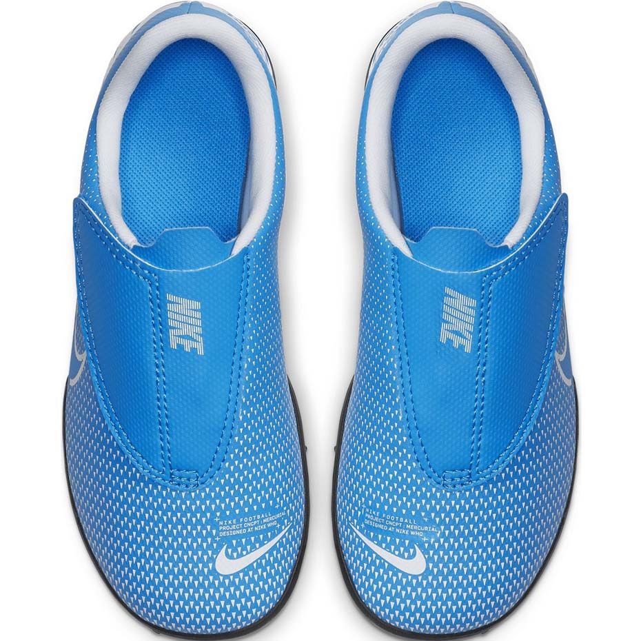 Dětské trávníky Nike Mercurial Vapor 13 Club z New Lights Collection - lehký, pohodlný a odolný návrh pro mladé hráče hrající rekreačně na umělých površích. Moderní design v intenzivním odstínu modrého, snadného nasazení s upevněním suchého zipu.