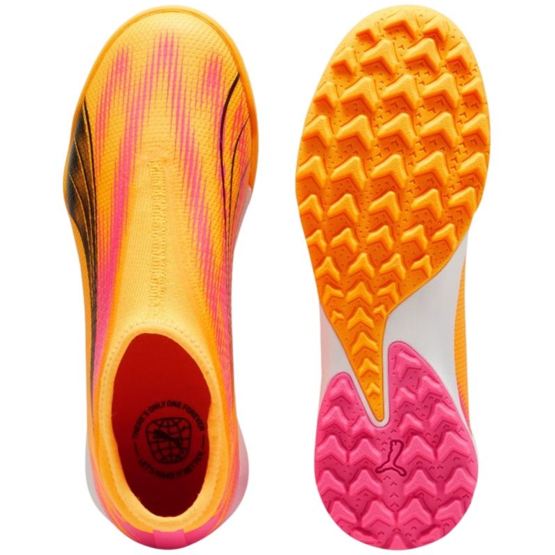Kopačky Puma Ultra Match LL TT+Mid Jr 107772 03 v oranžové barvě jsou perfektní volbou pro mladé fotbalisty, kteří chtějí na hřišti vyniknout. Tyto poloamatérské trávníky z premiérové kolekce Forever Faster kombinují vynikající technické vlastnosti a moderní design.