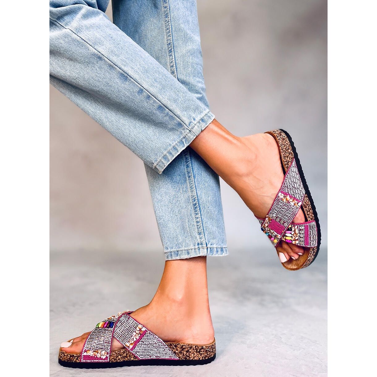 Objevte letní klasiku s fuchsiovými žabkami PA1! Tyto dámské žabky s korkovou podrážkou spojují ležérnost s módním stylem. Jejich jedinečný design přitahuje pozornost díky barevným korálkům a lesklým zirkonům, které jim dodávají etnický charakter. Jsou perfektní na dlouhé letní procházky, protože mají dokonale profilovanou vnitřní vložku potaženou měkkou tkaninou, která zajišťuje pohodlí při nošení po celý den.