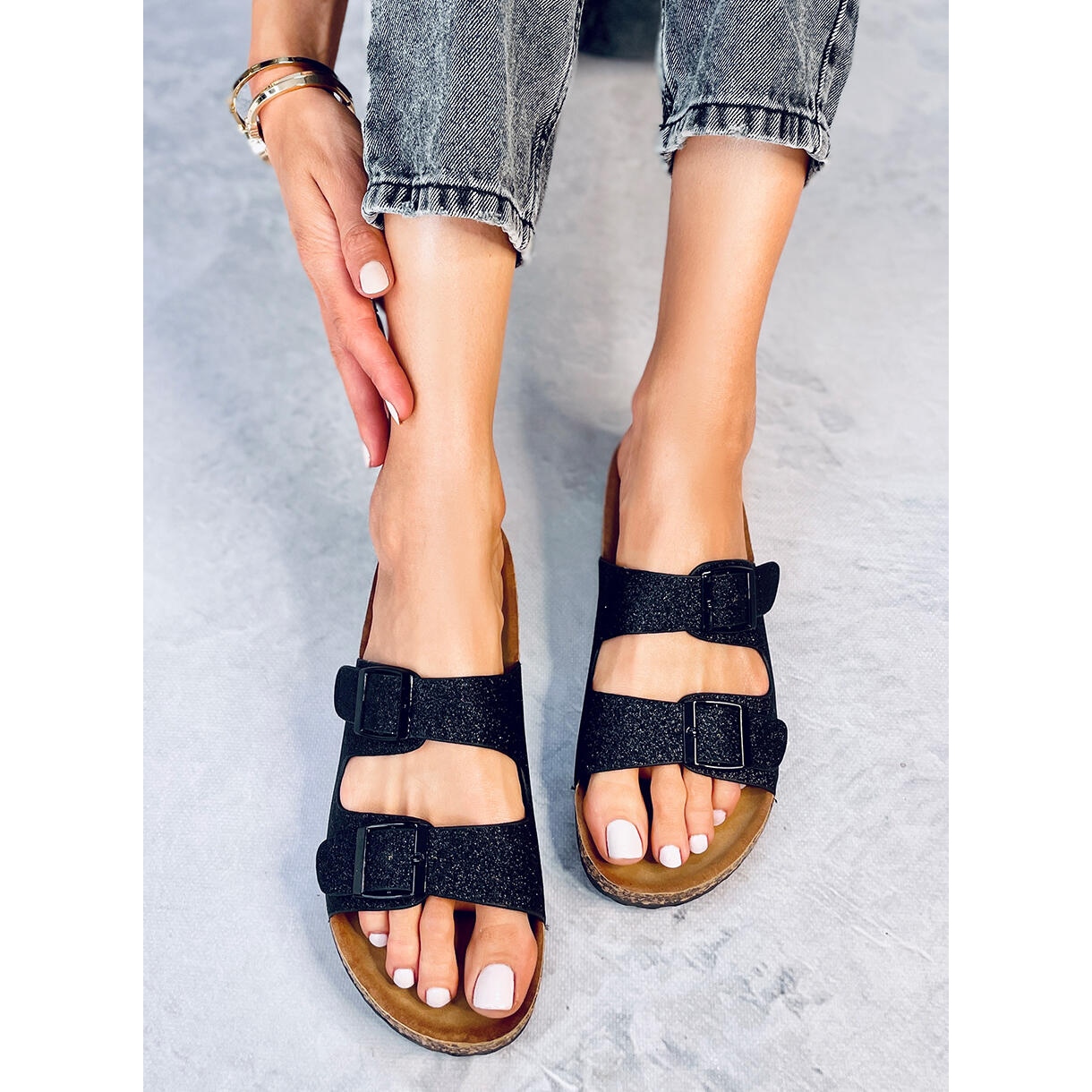 Alexa Black Glitter Flip Flip Flip Flip Flip Flip - elegantní a pohodlné ženské žabky, které přidají nádheru každodenním stylizacím. Černá, matná ekologická kůže s třpytivým povrchem, profilovaná vložka a nastavitelné spony zaručují pohodlí a perfektní zapadací po celý den.