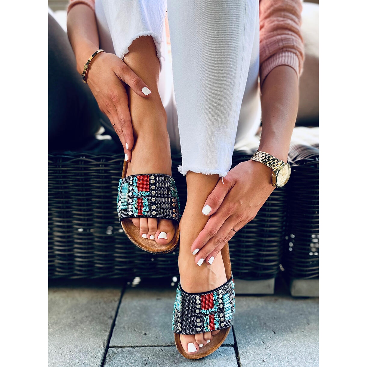 Žabky Taida Black jsou volnočasovou obuví, která bude perfektní pro každodenní styling. Díky svému jednoduchému a přitom elegantnímu designu budou perfektním doplňkem letních outfitů. Kamínky a kameny dodávají nádech půvabu, díky čemuž jsou vhodné pro každodenní nošení i pro zvláštní příležitosti.