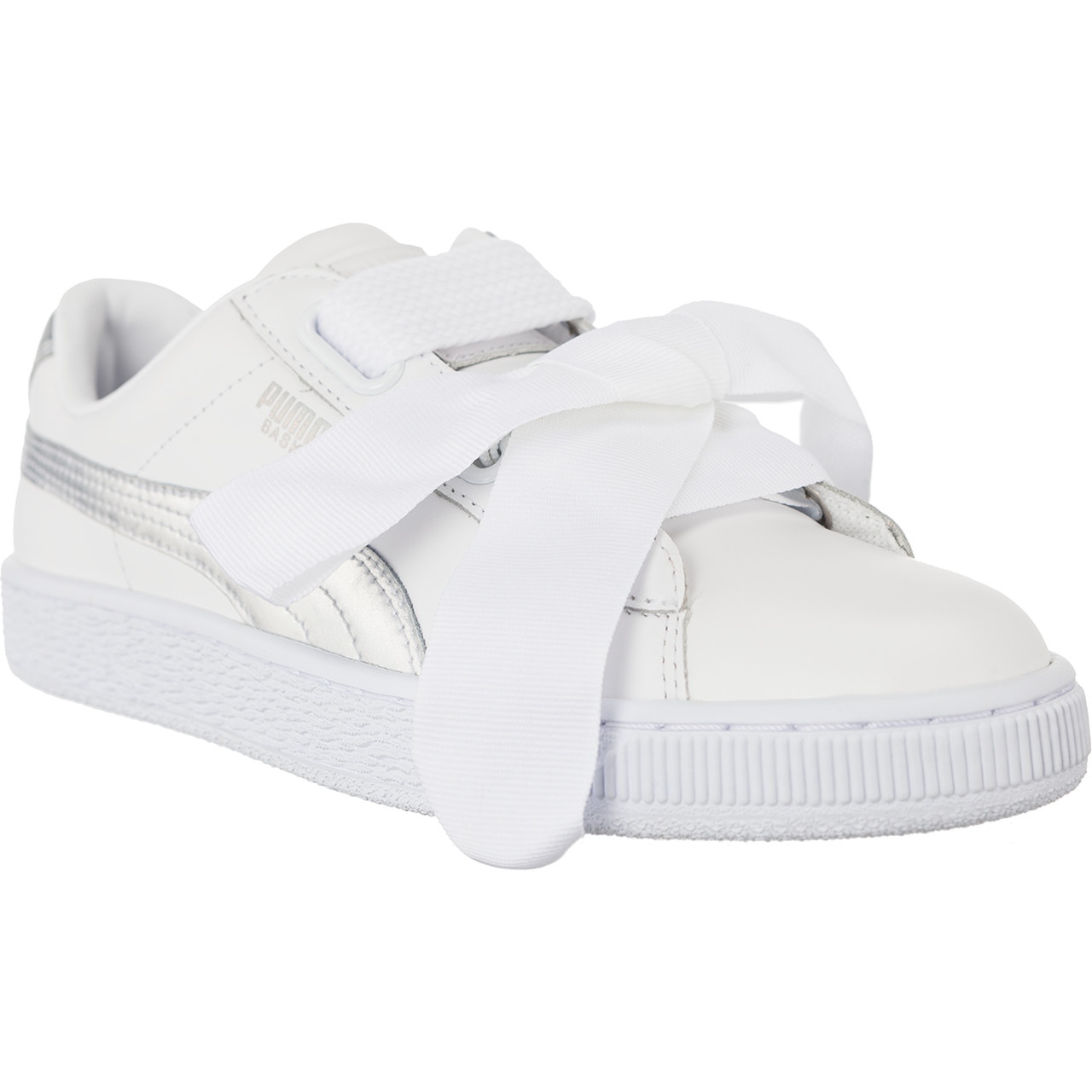 Klasika s ženským nádechem. Puma Basket Heart Explosive Wn je osvěžená verze ikonických basketbalových bot, která kombinuje nadčasovou štíhlou siluetu s dívčími detaily. Bílý svršek z ekologické kůže zdobí na boku metalický stříbrný akcent a charakter dodávají saténové tkaničky v podobě mašliček. Sada obsahuje také tlusté, tkané tkaničky - styl můžete měnit podle nálady.