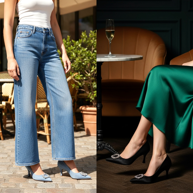 Pro každodenní nošení zkuste zkombinovat kotěcí podpatky s širokými džínami ve stylu palazzo a jemným topem. Tento outfit je mimořádně módní v roce 2026 - kontrast lehkosti širokých kalhot s elegancí kotěcích podpatků dodává sofistikovaný efekt.