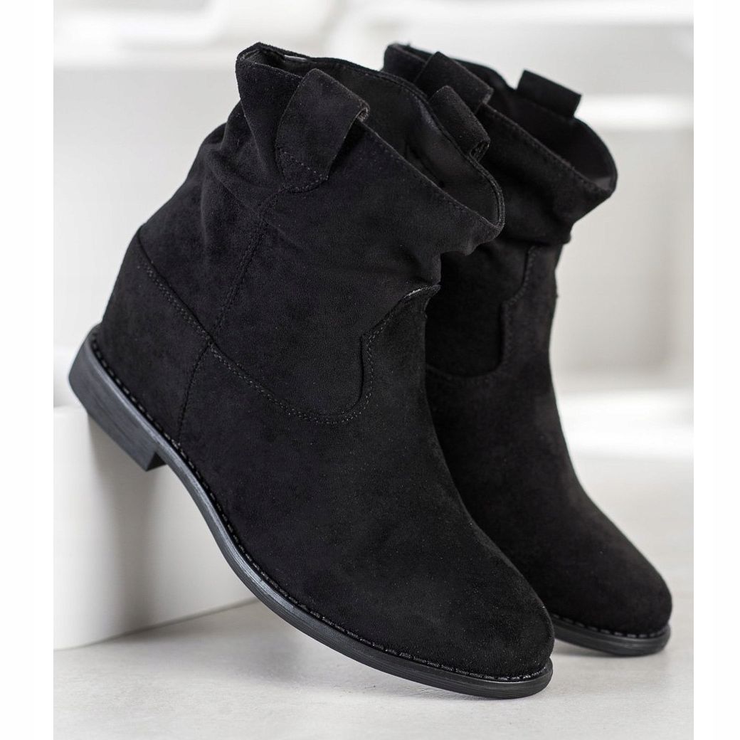 Boty mají kulatou špičku a zabudovanou, vyztuženou patu, která zajišťuje stabilitu a oporu chodidla. Vysoký svršek sahající ke kotníku vysoký 14-15 cm dodává eleganci a skrytý klín vysoký 7 cm opticky prodlužuje nohy a zvýrazňuje postavu. Hladká podrážka vyrobená ze syntetického materiálu zaručuje odolnost a trakci v různých podmínkách.