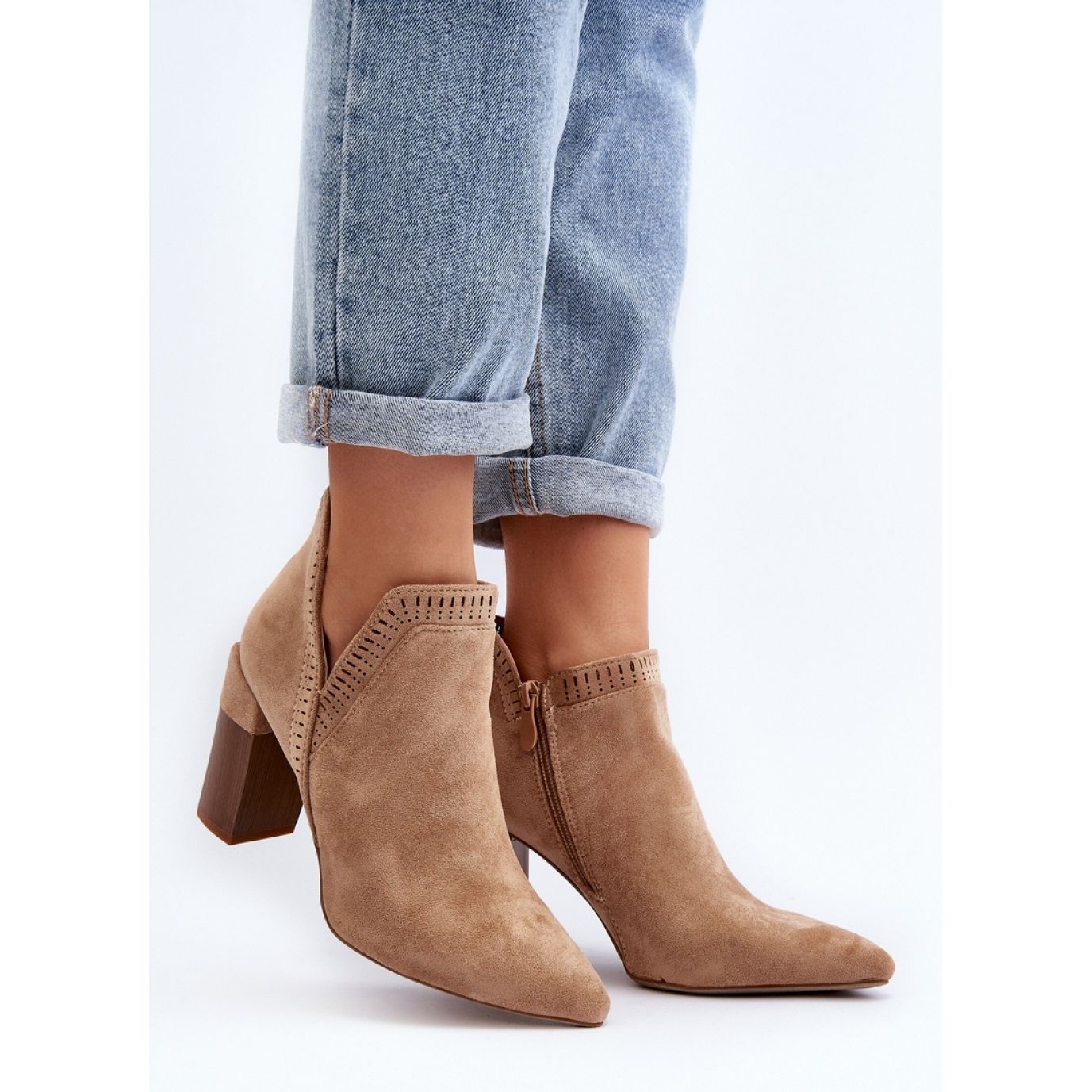 9 cm vysoký horní horní část je efektivně zdobena vzorem s otevřeným dílem, což jim dává jedinečný charakter. Díky zipu na boku se nasazení a sundávání obuvi bude rychlé a pohodlné. Nosy v Spitzu budou účinně opticky štíhlé nohy, což způsobí, že každá stylizační lehkost a ženskou milost.