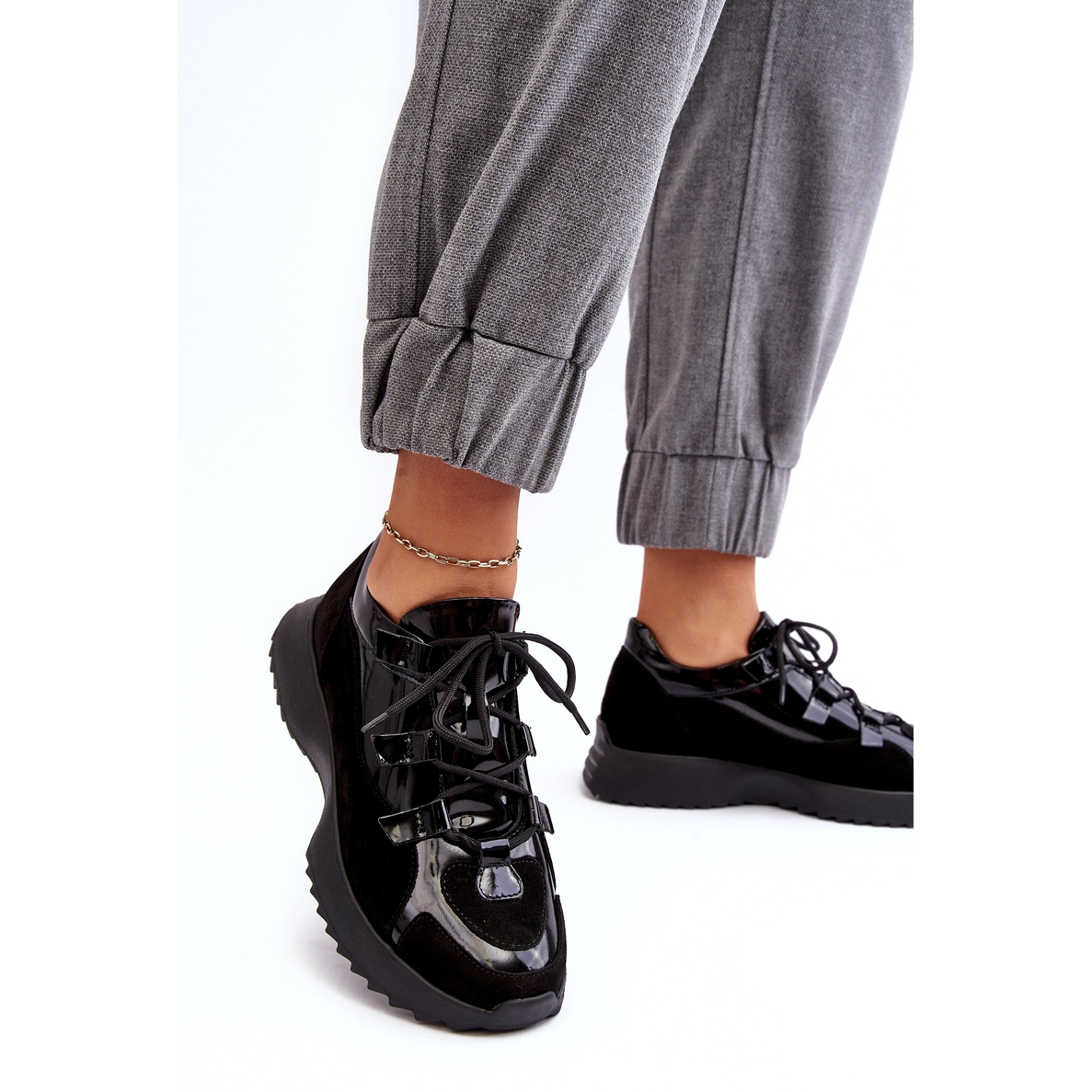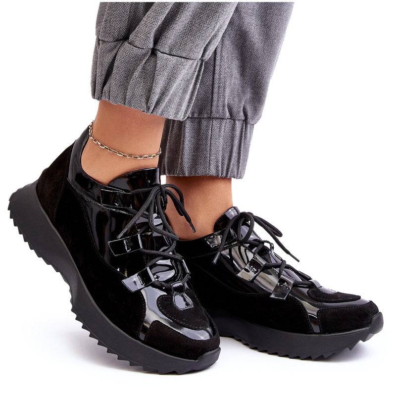 Popisovaný produkt je dámská sportovní obuv od Zazoo. Jsou vyrobeny z přírodní černé lakované kůže, která jim dodává elegantní vzhled. Boty mají platformu (2,5 cm), která dodává další výšku, a vyztuženou patu, která zajišťuje stabilitu a bezpečnost. Doplňkovým prvkem ovlivňujícím komfort používání je měkká kožená stélka.