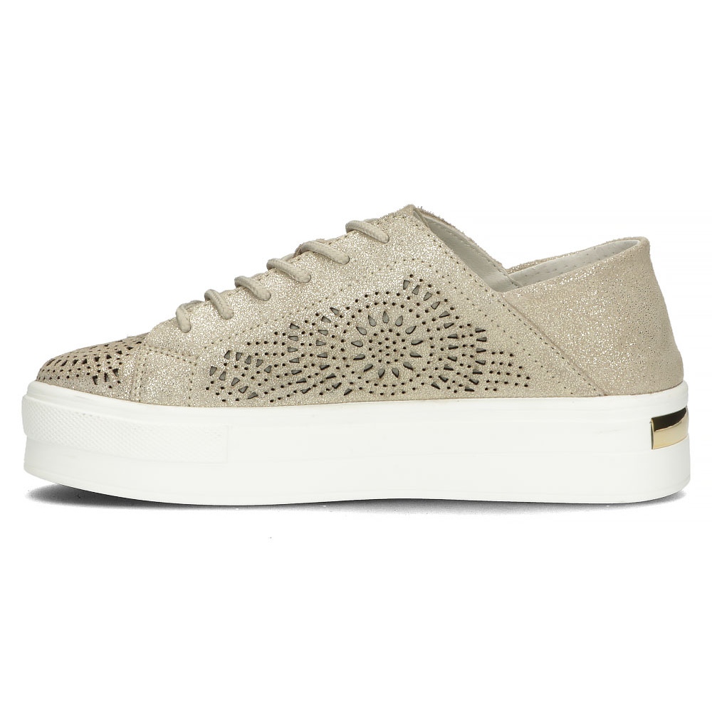 Tyto nízké boty s kulatou špičkou nabízejí celodenní pohodlí. Šněrovací uzávěr zajišťuje bezpečné uchycení na noze a vnitřní podšívka, rovněž z přírodní kůže, zajišťuje potěšení z používání. Podešev ze syntetického materiálu je odolná proti poškození, což znamená, že boty si déle udrží svou estetiku.