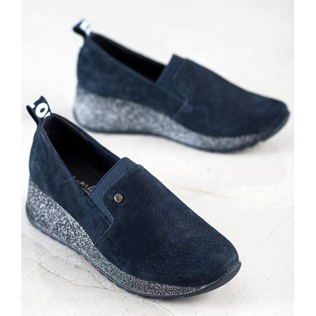 Svršek z vysoce kvalitní námořnické modré přírodní kůže zajišťuje nejen elegantní vzhled, ale také odolnost. Kulatý nos a mírně vyvýšená přední část jim dodávají svěží vzhled a pružný gumový klínek na zápěstí dělá jejich oblékání skutečným potěšením.
