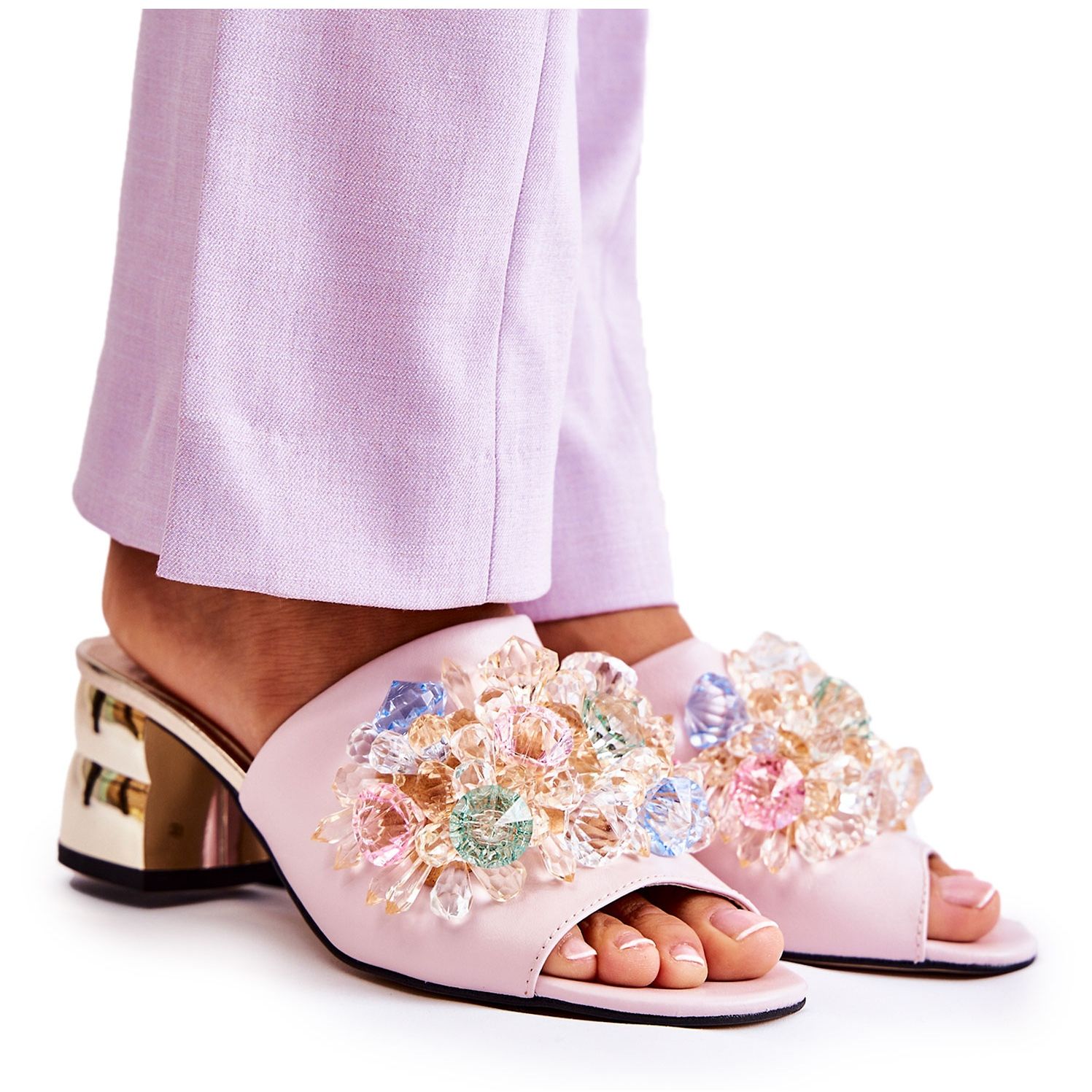 Podrobnosti: PA2 Kožené dámské pantofle na vysokých podpatcích s růžovým zdobením Calinda