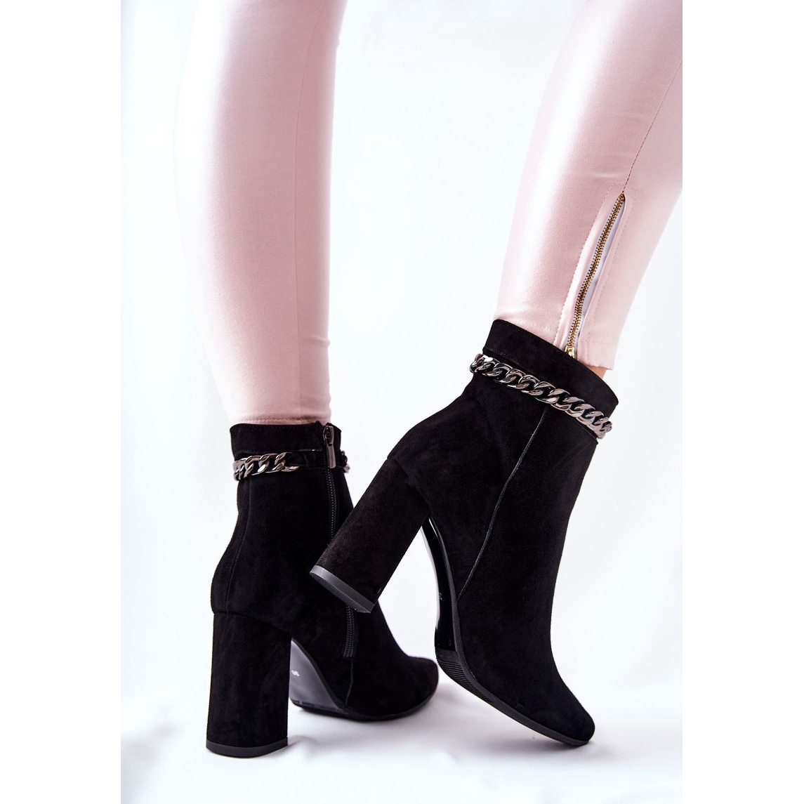 Dobře se mísí s hubenými džíny, midi -tumory nebo vlněnými sukněmi. Černý semiš a dekorativní řetězec vám umožňují vytvářet jak každodenní i elegantnější sady.