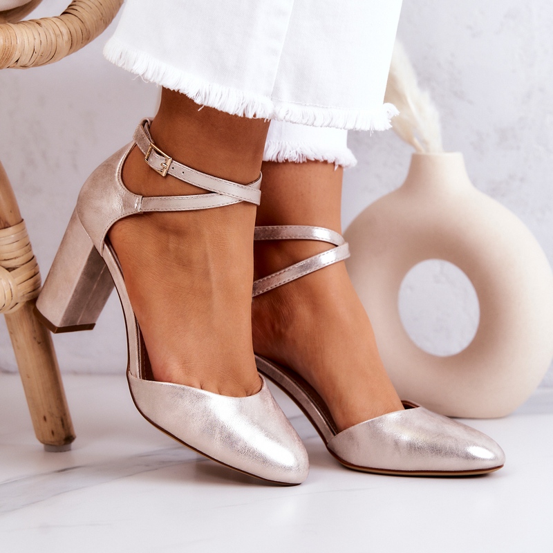 Objevte mimořádné kožené lodičky Sergio Leone SK851 na vysokém podpatku v elegantní zlaté barvě, které skvěle doplní každý dámský styling. Vyrobeny z nejkvalitnější eko kůže, spojují styl a pohodlí nošení. Zapínání na přezku s nastavitelným páskem zaručuje dokonalé přizpůsobení noze a měkká stélka z přírodní kůže zajistí, že se vaše nohy budou cítit pohodlně i po dlouhých hodinách chůze.