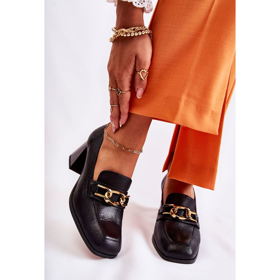 Kožená čerpadla s řetězcem Laura Messi 2515 - klasika s módním přízvukem. Elegantní, vyrobená z vysoce kvalitní přírodní kůže, kombinujte pohodlí a styl díky měkké kožené a stabilní vložce 7 cm ve formě bloku. Dekorace ve formě řetězu na přední straně dává botám moderní postavu a ztužená pata zajišťuje dobrou stabilizaci nohou. Čtvercový model s čtvercovým nosem - nadčasový a univerzální.