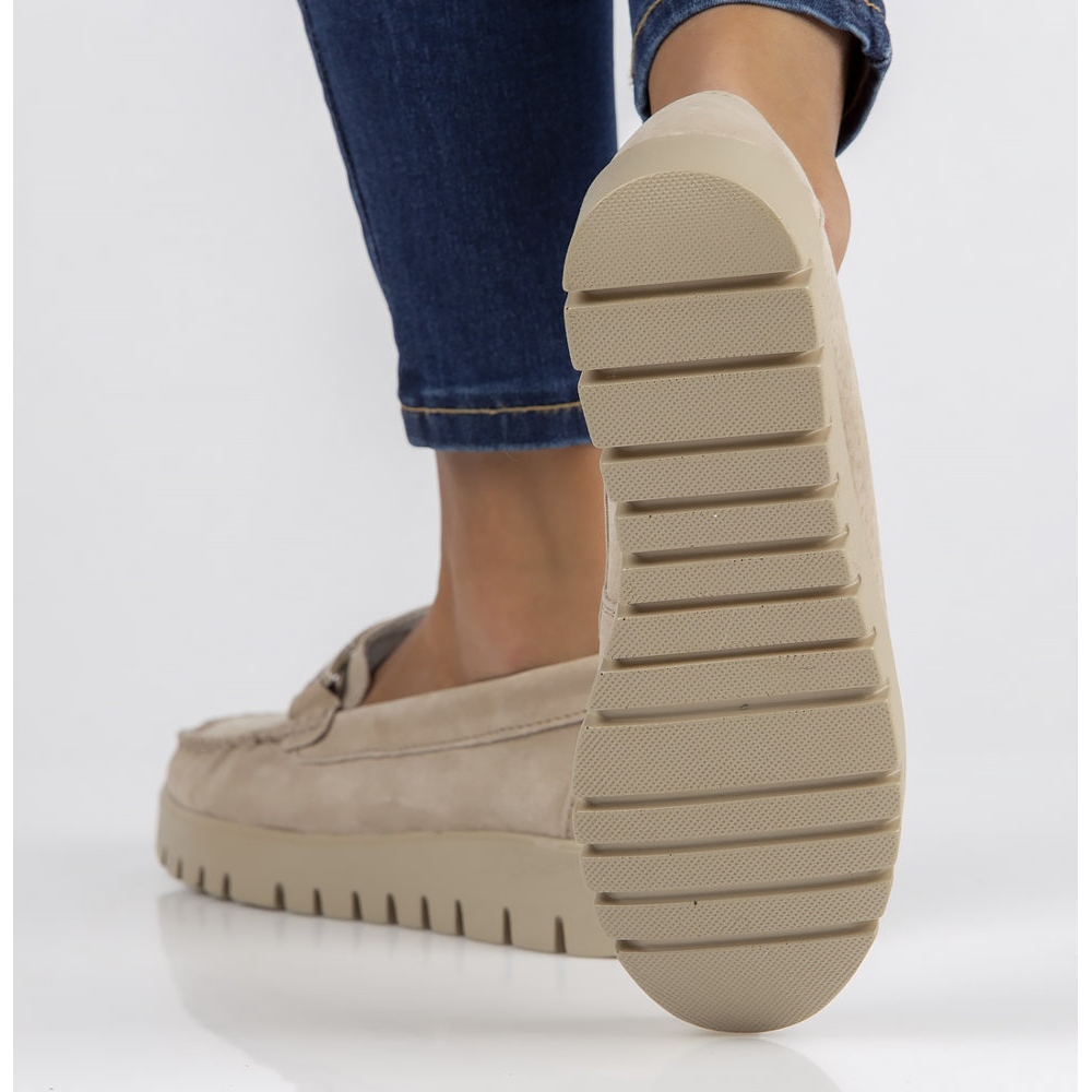 Díky plochému podpatku a výšce platformy 2 cm jsou tyto mokasíny ideálním řešením pro každodenní vycházky. Kulatý nos a navlékací spona umožňují rychlé a pohodlné nasazování. Jejich univerzální béžová barva se navíc skvěle hodí k různým stylům, jak ležérním, tak elegantnějším.