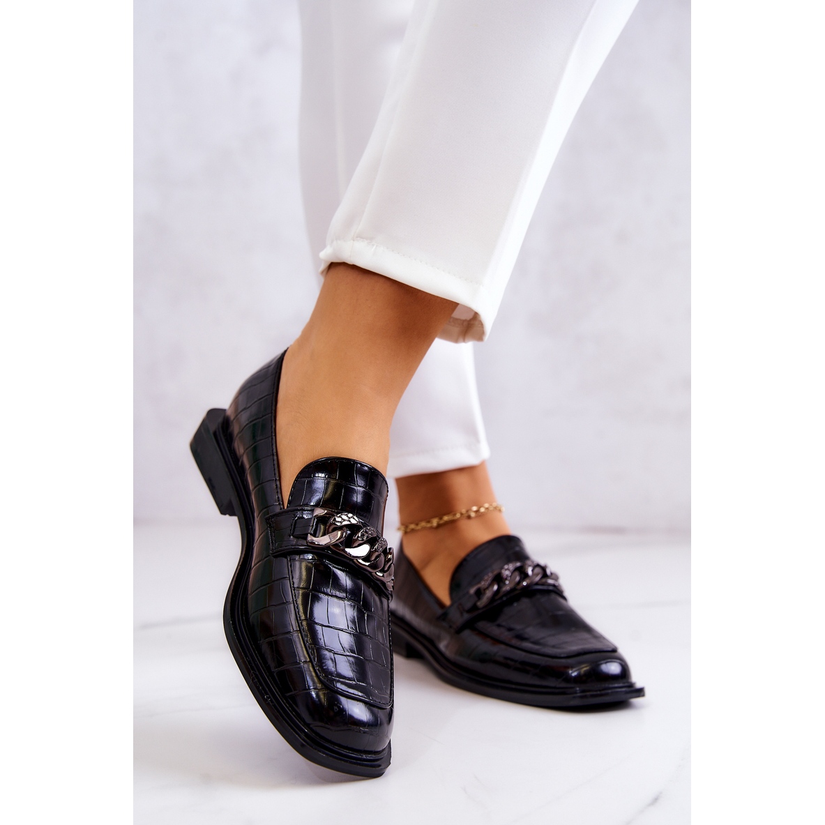 Mokasíny zdobí klasický řetízek, který jim dodává eleganci a charakter. Vyrobeny z ekologické kůže jsou nejen módní, ale také šetrné k životnímu prostředí. Pohodlná stélka z přírodní kůže jistě zpříjemní každý krok a díky vysoké kvalitě materiálů se z nich budete dlouho těšit.