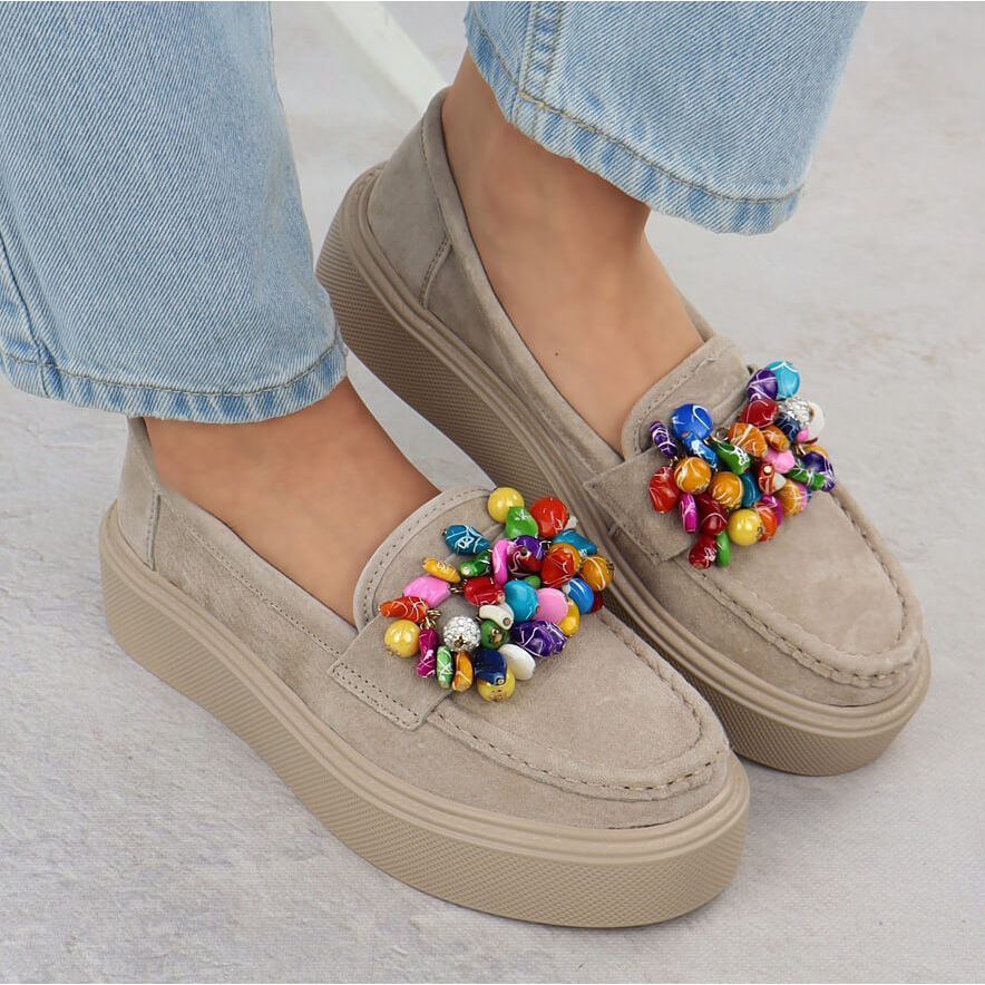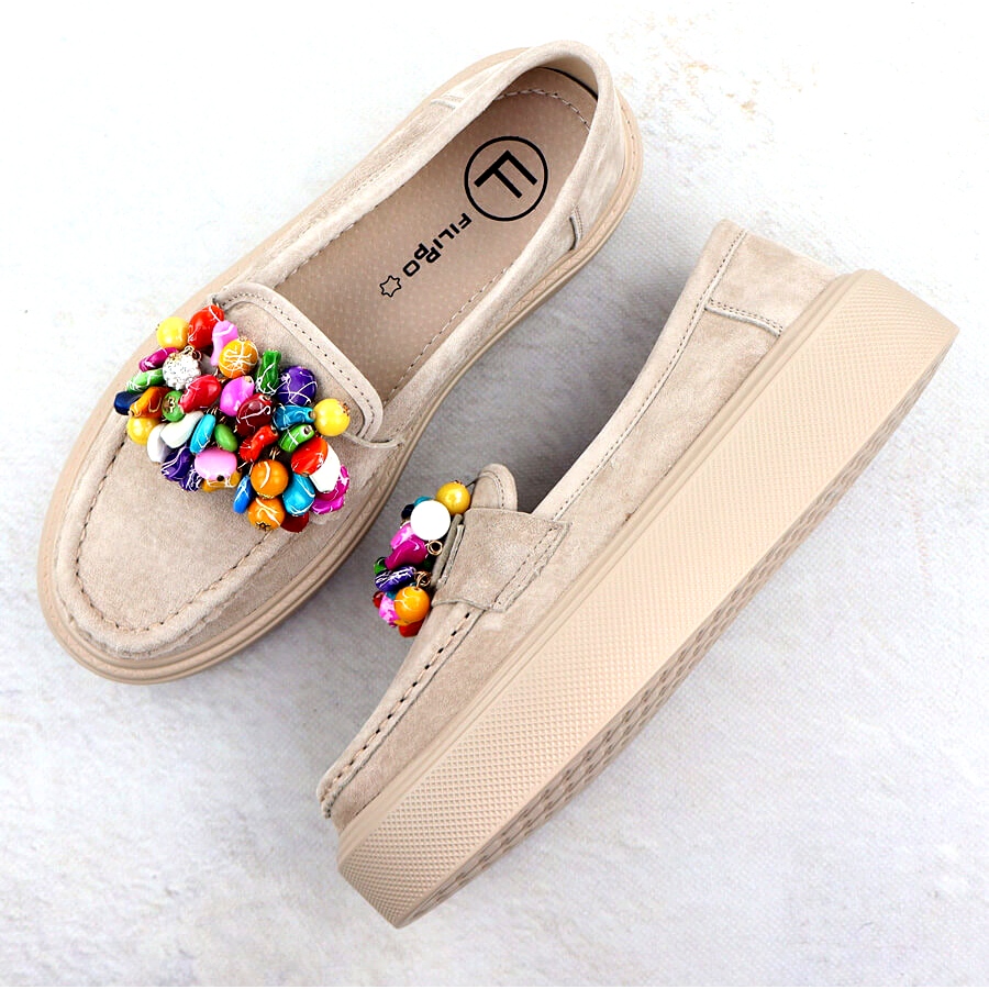 Kožené mokasíny na platformě s béžovou béžovou Filippo DP6765 jsou skvělým návrhem pro ženy, které chtějí kombinovat pohodlí s módním vzhledem. Tyto boty jsou vyrobeny z nejvyšší kvalitní přírodní semišové kůže nejen elegantně, ale také odolné a pohodlně.