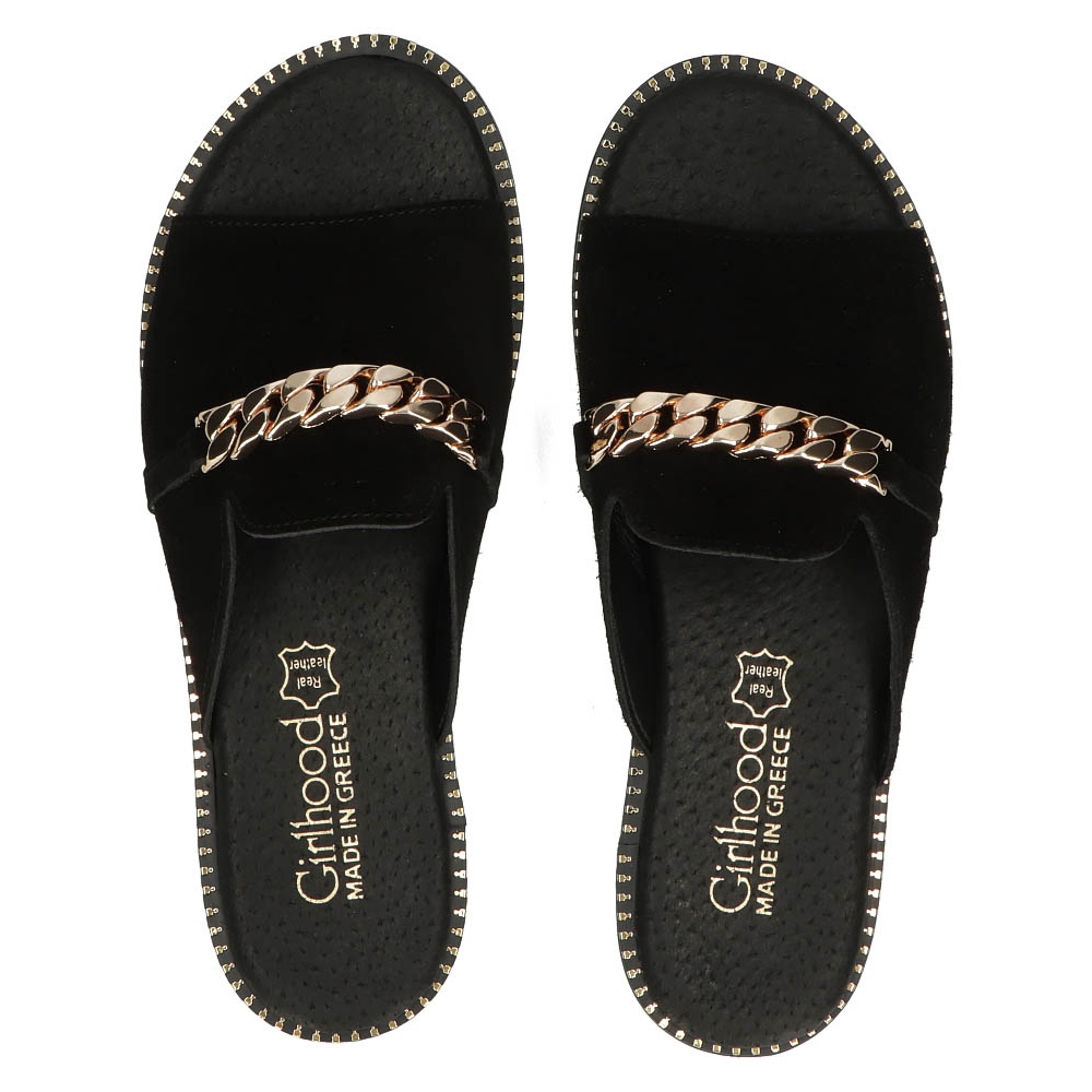 Černá barva a minimalistický design dělají žabky dokonale v souladu s nejnovějšími módními trendy a další akcenty v podobě kamínků a řetízku jim dodávají charakter. Bez špičky, s kulatým tvarem a výškou podpatku pouze 1 cm jsou tyto žabky perfektní volbou do teplých dnů, jak do města, tak na výlety.