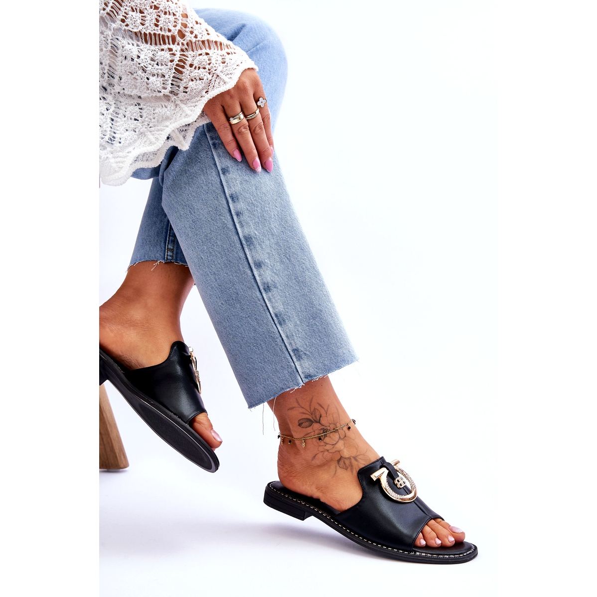 Tento model je osazen na 2 cm vysokém plochém podpatku, který zajišťuje pohodlí i při dlouhodobém nošení. Ozdoby v podobě cvočků na podrážce navíc dodávají žabkám jedinečný vzhled. Díky černému exteriéru s jemnými zlatými akcenty se žabky perfektně hodí k různým stylům, letním i ležérním.