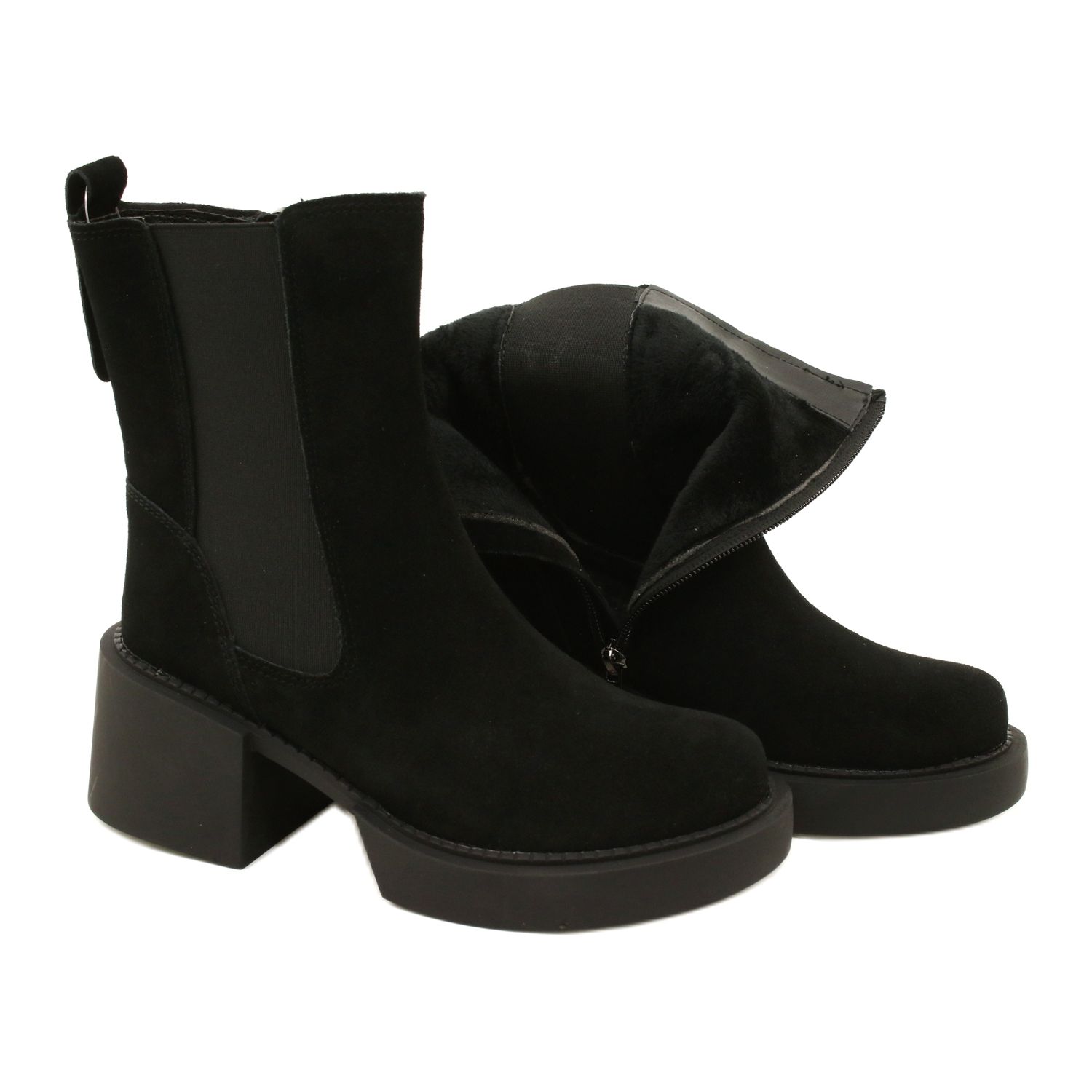 Elegantní, nadčasové boty, které kombinují klasiku s moderním stylem. Vyrobeno z přirozené semišové kůže v intenzivní černé barvě, s pečlivým povrchem a detaily, které zvyšují pohodlí. Širší, stabilní pata jako blok (6 cm) a jemná kulatá špička zajišťují pohodlí po celý den a měkká, černá kožešinová uvnitř efektivně zahřívá i v chladnějších dnech. Zámek usnadňuje rychlé oblékání, díky kterým jsou boty skvělé pro každodenní i formálnější stylizace.