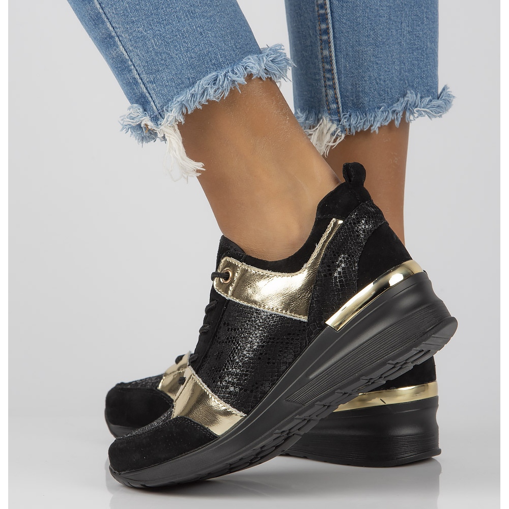 Tenisky mají šněrovací zapínání, které umožňuje snadné nastavení obvodu a stabilizaci chodidla. Kulatá špička dodává jemnost a 4,5 cm vysoký klínek s 1,5 cm platformou vám umožní vychutnat si lehkost a větší výšku bez kompromisů v pohodlí.