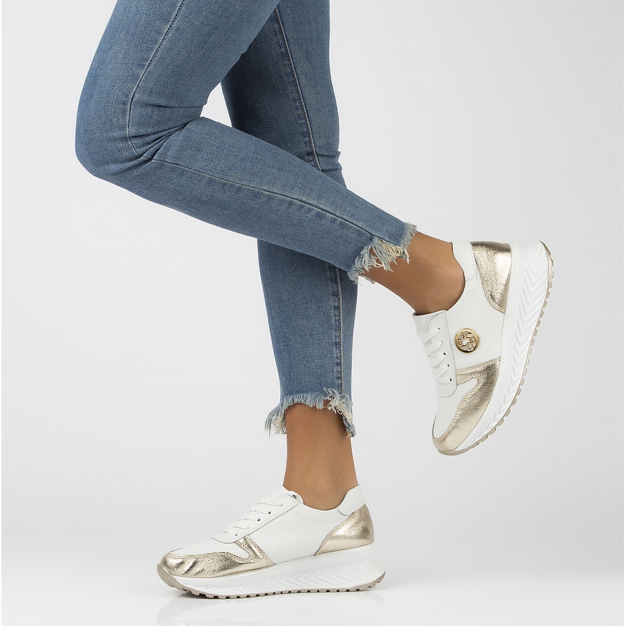 Představujeme kožené tenisky Filippo DP3547/22 WH GO v elegantních bílých barvách se zlatými akcenty. Tyto jedinečné boty, vytvořené s ohledem na ženy, dokonale kombinují styl s pohodlím a dokonale ladí s každodenním sportovním vzhledem.