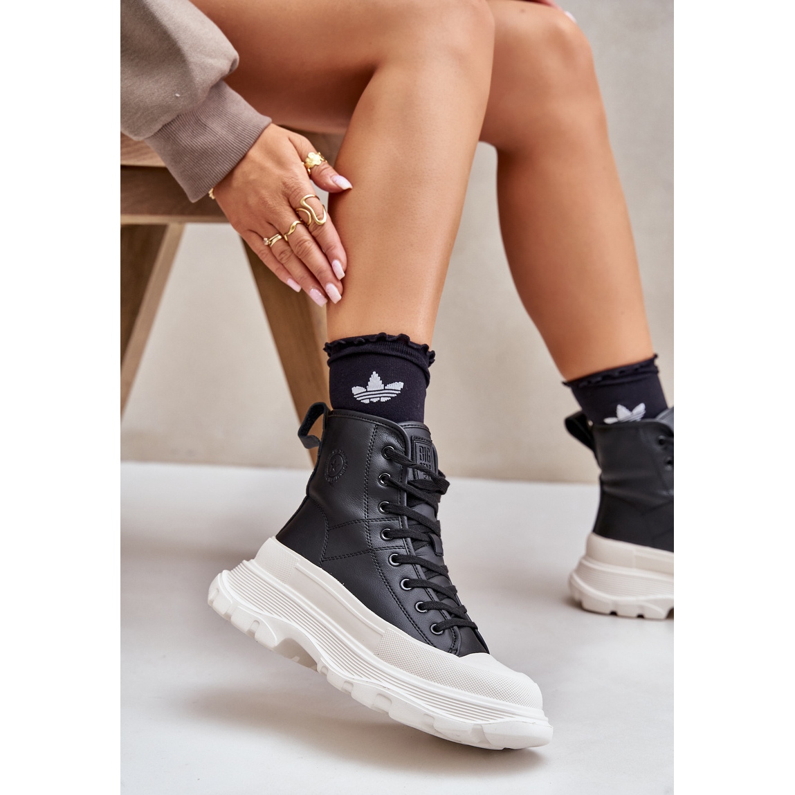 Masivní 6,5 cm vysoká platforma dává charakter a moderní vzhled, dokonale odpovídající řadě každodenních stylizací. Díky šněrování můžete snadno přizpůsobit tyto tenisky na nohu, což zajišťuje stabilitu a pohodlí v každém kroku. Interiér obuvi lemované příjemným kabátem z ovčí kůže způsobuje, že vaše nohy jsou teplé a pohodlné, bez ohledu na povětrnostní podmínky.
