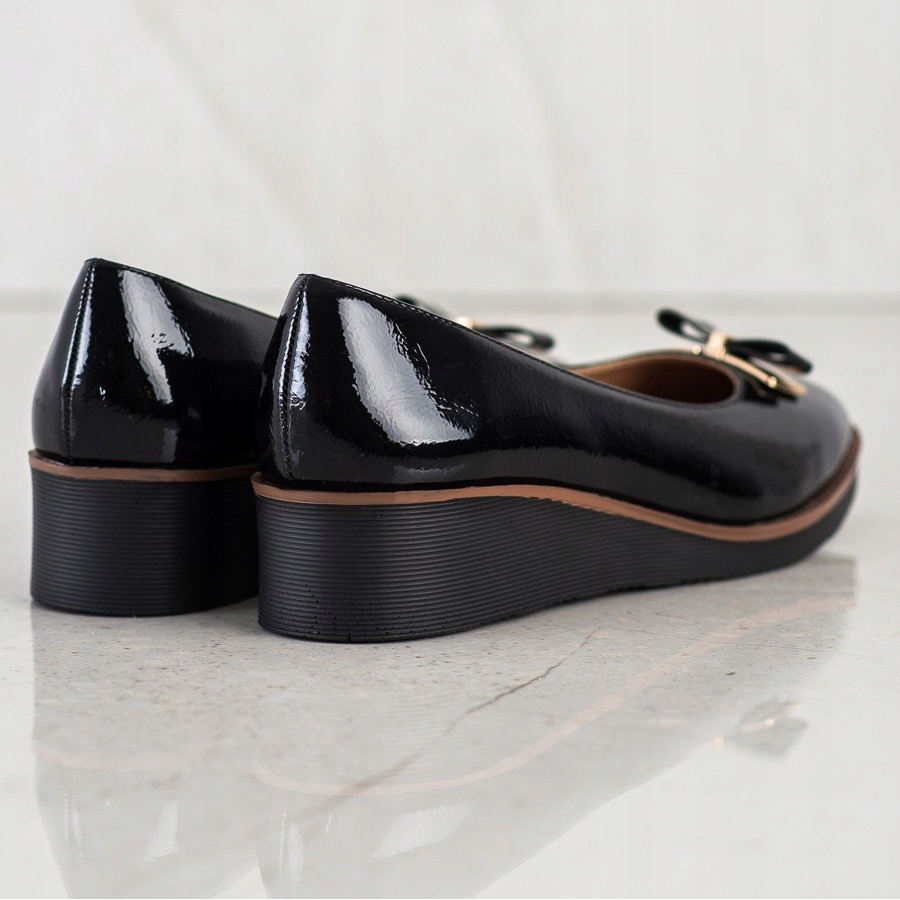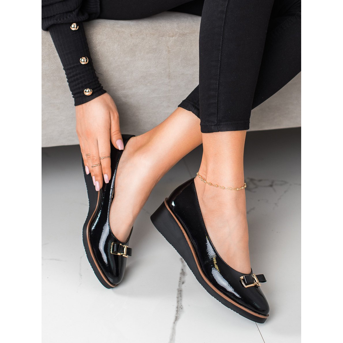 Lakované balerínky VINCEZA v černé barvě jsou perfektní volbou pro ženy, které oceňují eleganci a pohodlí. Tyto stylové boty na nízkém klínku vysoké 5 cm zeštíhlí vaše nohy díky prodloužené špičce. Elegantní mašle na vrcholu dodává šarmu a jedinečný charakter.