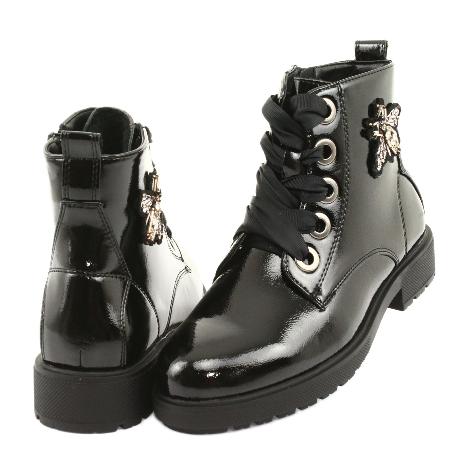 Lakované kotníkové boty Mucha Sergio Leone 530 v elegantní černé barvě jsou perfektní volbou pro každou módní ženu, která chce spojit pohodlí s šik. Tyto kotníkové boty vyrobené z vysoce kvalitní eko kůže vynikají precizním řemeslným zpracováním a smyslem pro detail. Stylový motýlek a decentní ozdoby v podobě zirkonů a kamínků jim dodávají jedinečný charakter, díky čemuž se hodí ke každodennímu i elegantnímu stylu.