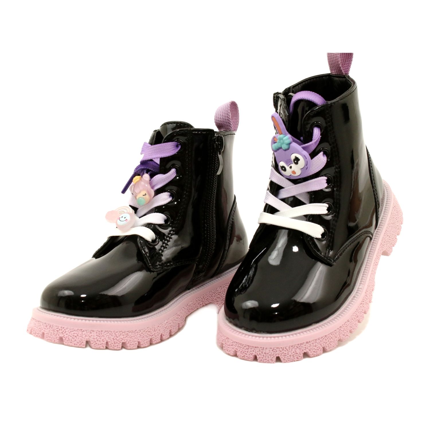 Slečna 23DZ23-6582 Vasnená bota a pohodlí pro malou holčičku. Vyrobeno z vysoce kvalitní ekologické kůže v elegantní černé barvě s růžovými akcenty, kombinují každý den dívčí vzhled s praktickými řešeními. Lesklý povrch a dekorativní manžetové kliknutí "Klikněte" připojené k tkaničkám přidávají okouzlující a módní uspořádání.