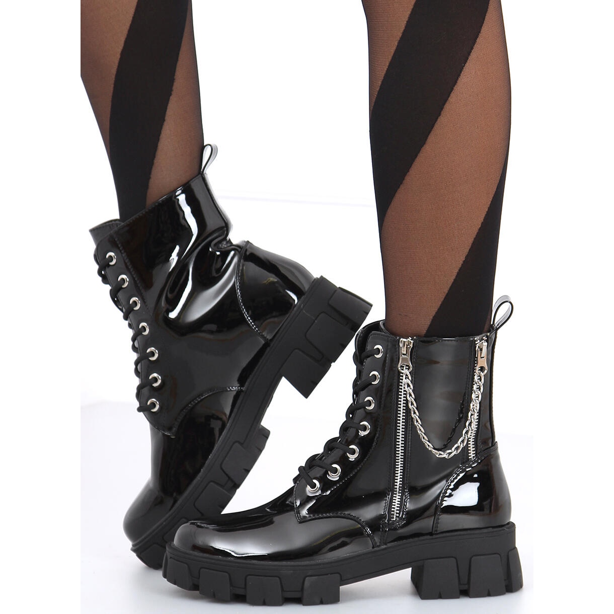 Objevte novou dimenzi módy s patentovanými kotníčkovými botami Mina Black s řetízkem! Tyto jedinečné černé pracovní boty se silnou podrážkou nesmí chybět v žádném dámském šatníku. Jejich lakovaný povrch nejen přitahuje pozornost, ale také dodává charakter každému stylingu.