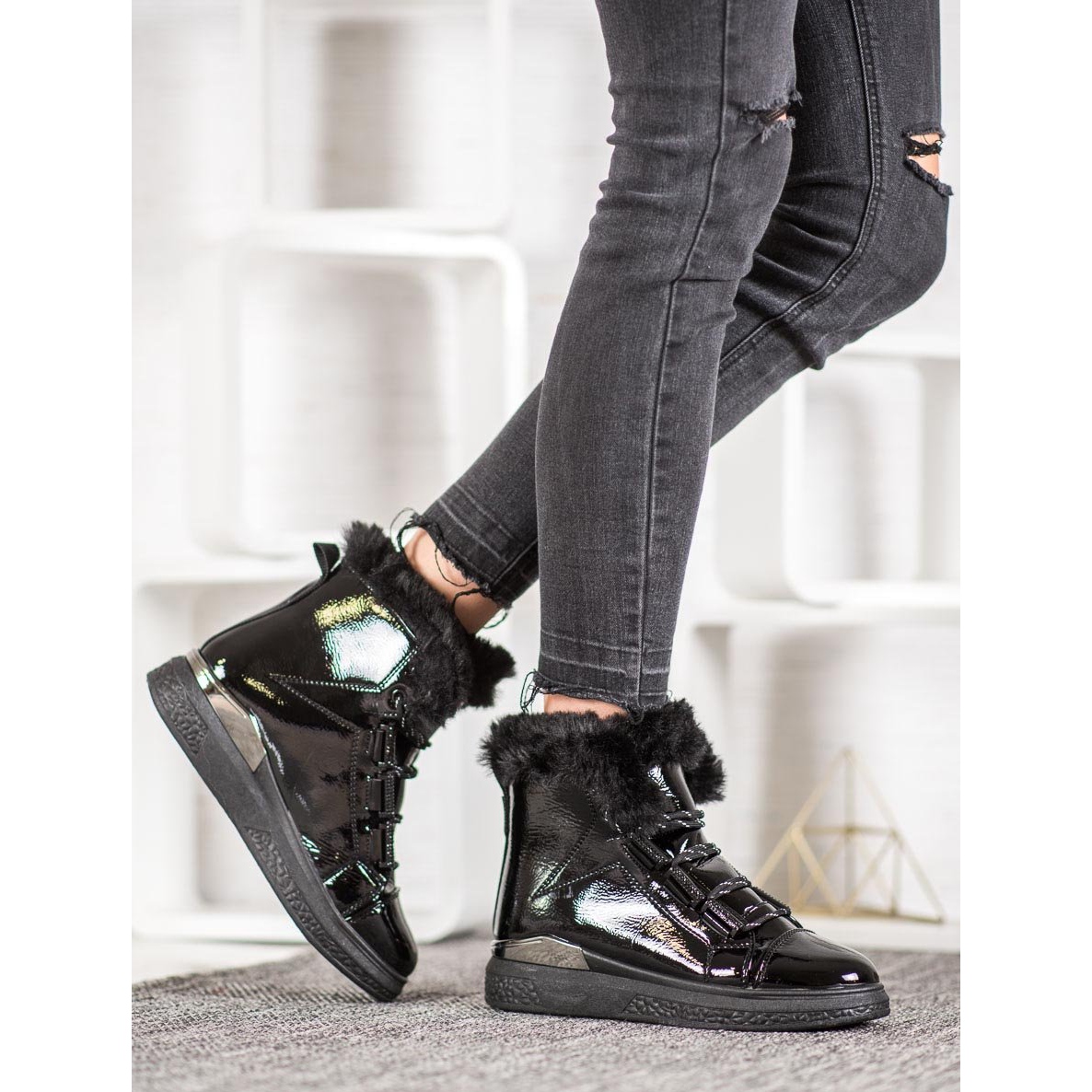 Sněhule vyrobené z vysoce kvalitní imitace kůže upoutají pozornost nejen lakovanou úpravou, ale zaručují také odolnost a snadnou údržbu. Vnitřek bot je vyplněn měkkými textilními materiály, které zajistí pohodlí po celý den. Kožešina na svršku jim navíc dodává jedinečné kouzlo a dělá je ještě příjemnějšími.