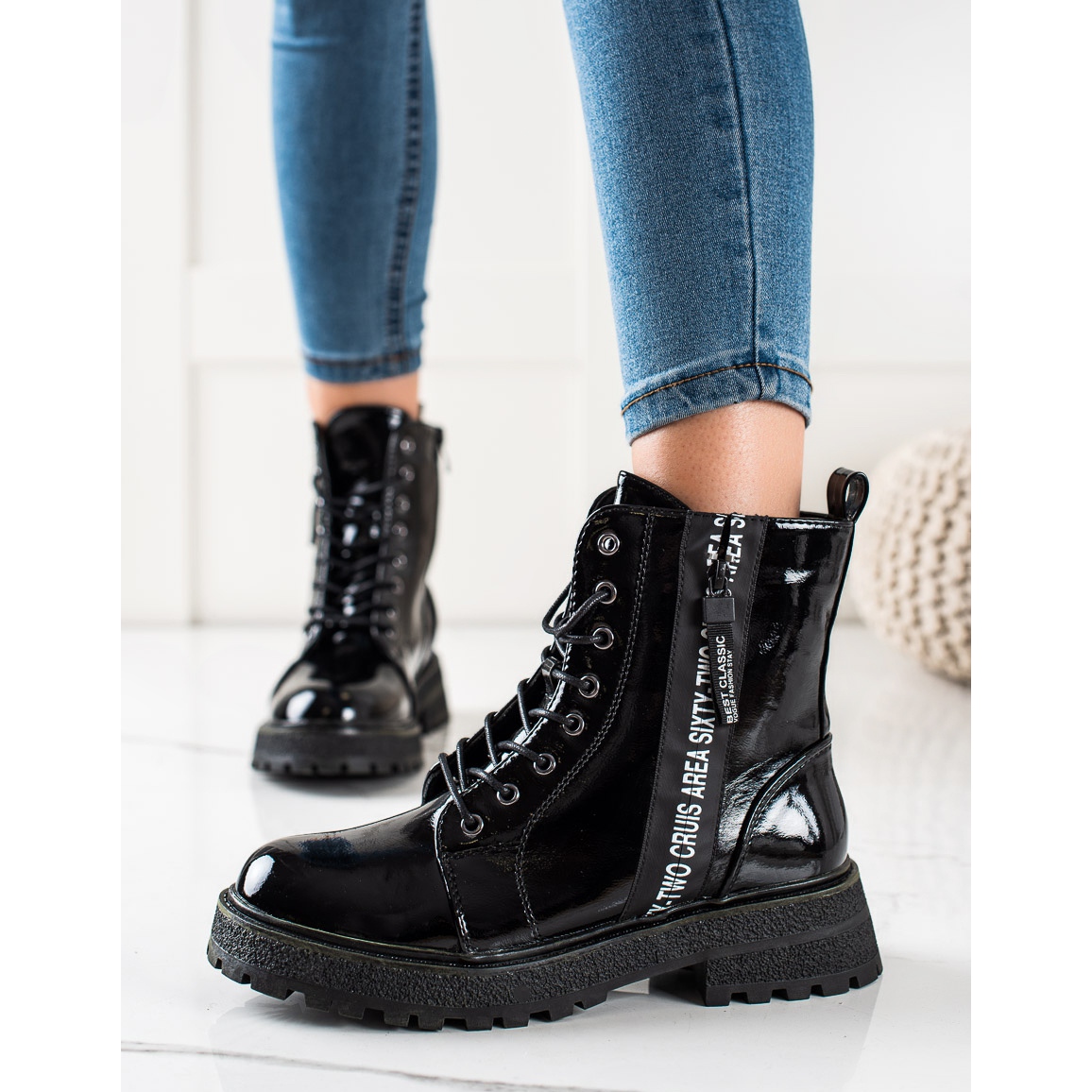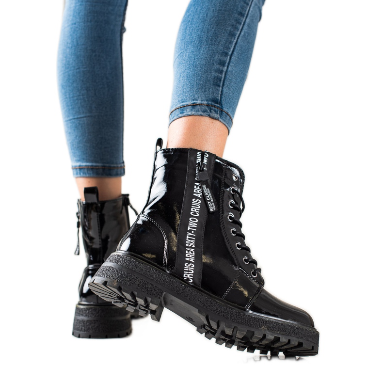 Černá barva a lakovaná ekologická kůže dodávají botám elegantní vzhled a ozdobný zip přitahuje pohled a dodává jim jedinečný charakter. Zip a šněrování zajišťují snadné nazouvání a dokonalé přizpůsobení noze.