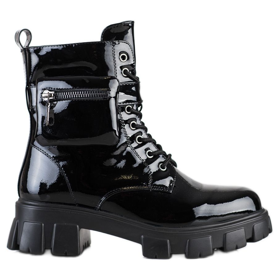 Kozačky se zapínají na zip a šněrují, což umožňuje snadné přizpůsobení noze a rychlé ovládání. Díky jejich univerzální černé barvě se hodí prakticky ke každému stylu a lakovaný materiál jim dodává módní, moderní vzhled.