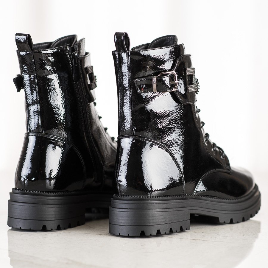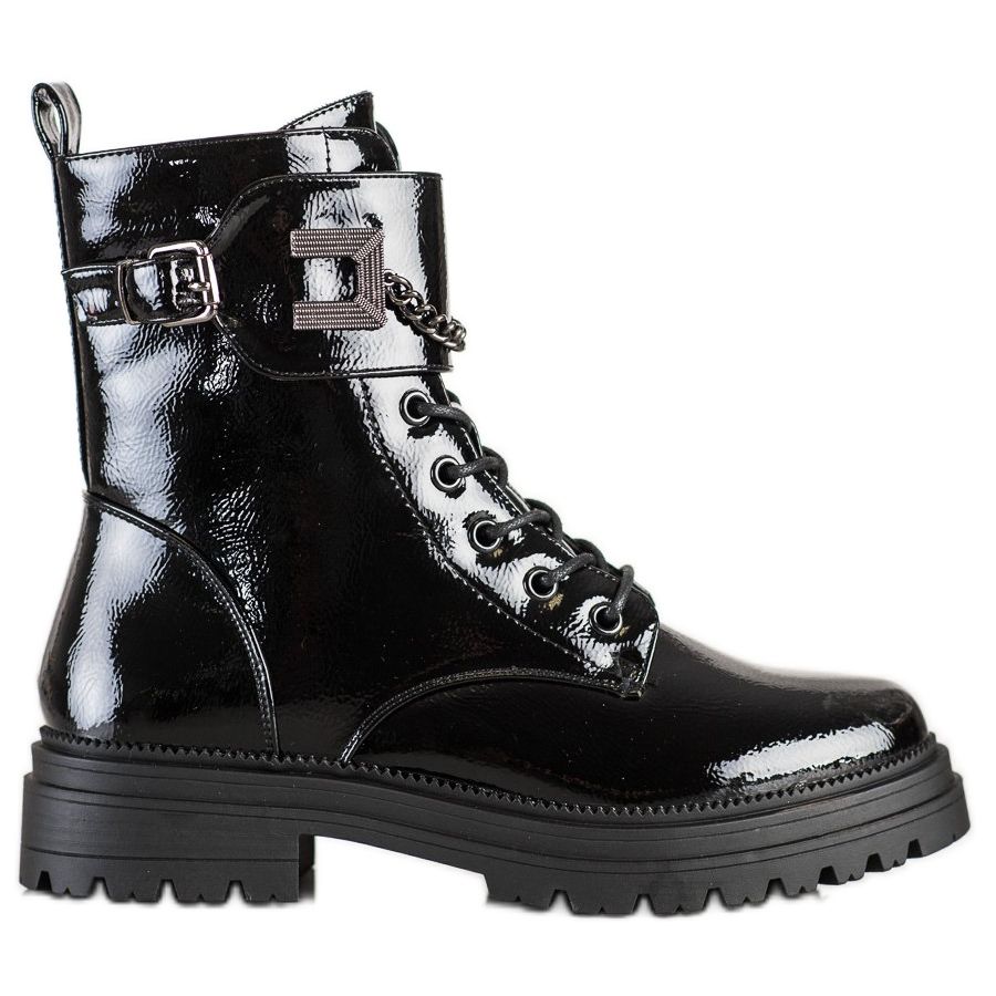Objevte jedinečný styl a pohodlí v nové kolekci S. BARSKA! Lakované dělnické kozačky s řetízkem v černé barvě nesmí chybět ve vašem šatníku pro sezónu podzim/zima. Tyto mimořádné boty dokonale kombinují ležérní, rockový a módní styl a dodávají vašemu outfitu charakter.