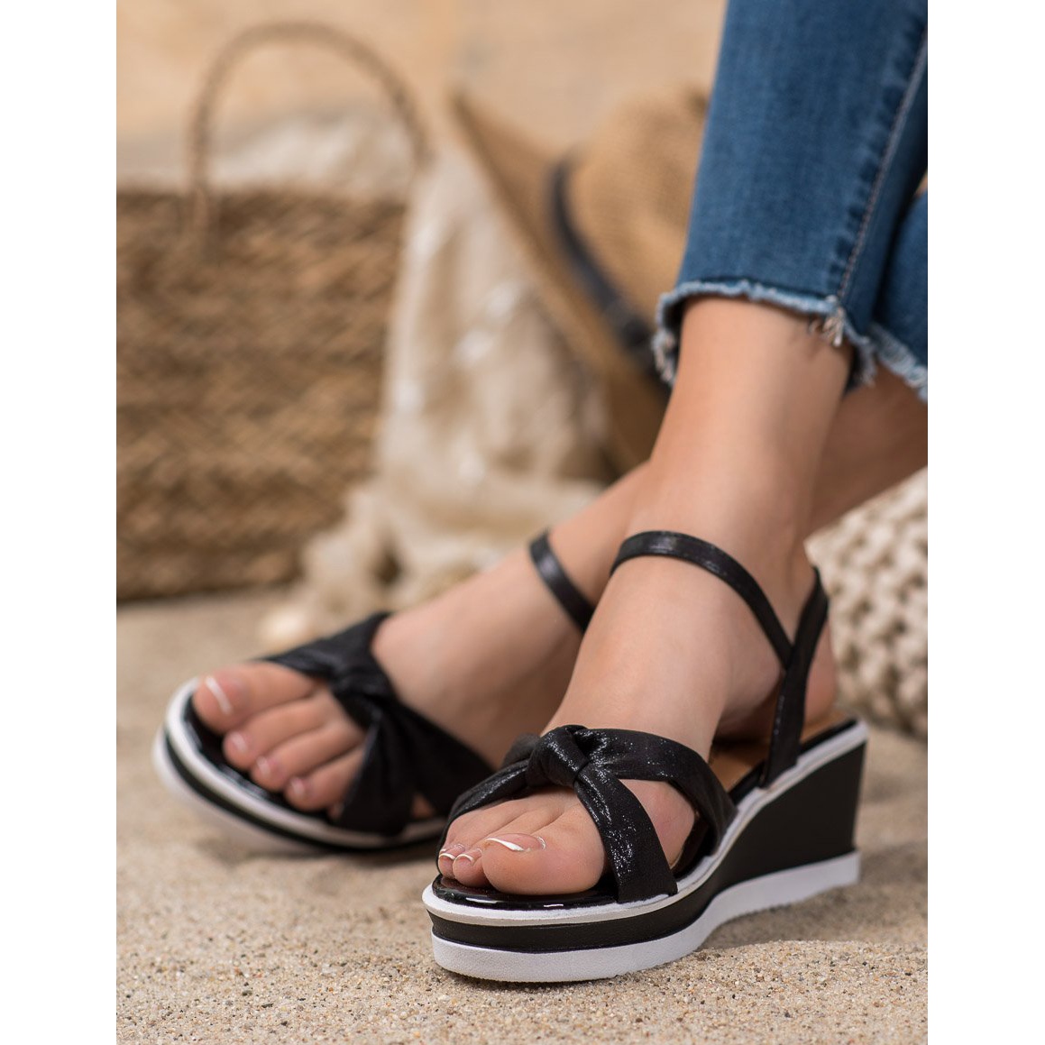 Sandály jsou vyrobeny z vysoce kvalitní ekologické kůže, která zajišťuje pohodlí a odolnost. Otevřená pata a přezka umožňují snadné nazouvání a přizpůsobení noze. 6 cm vysoký klín a 2,5 cm platforma zaručují pohodlí při nošení a přidávají vám pár centimetrů na výšce.