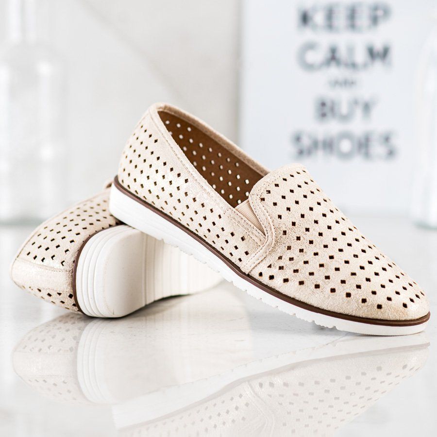 Představujeme zlaté prolamované slipony od výrobce Kylie, které jsou perfektní volbou na jaro a léto. Tyto stylové boty jistě padnou do oka každé milovnici módy. Jejich jedinečná, lesklá zlatá barva doplňuje jakýkoli ležérní styl, díky čemuž jsou skutečnou nutností této sezóny.