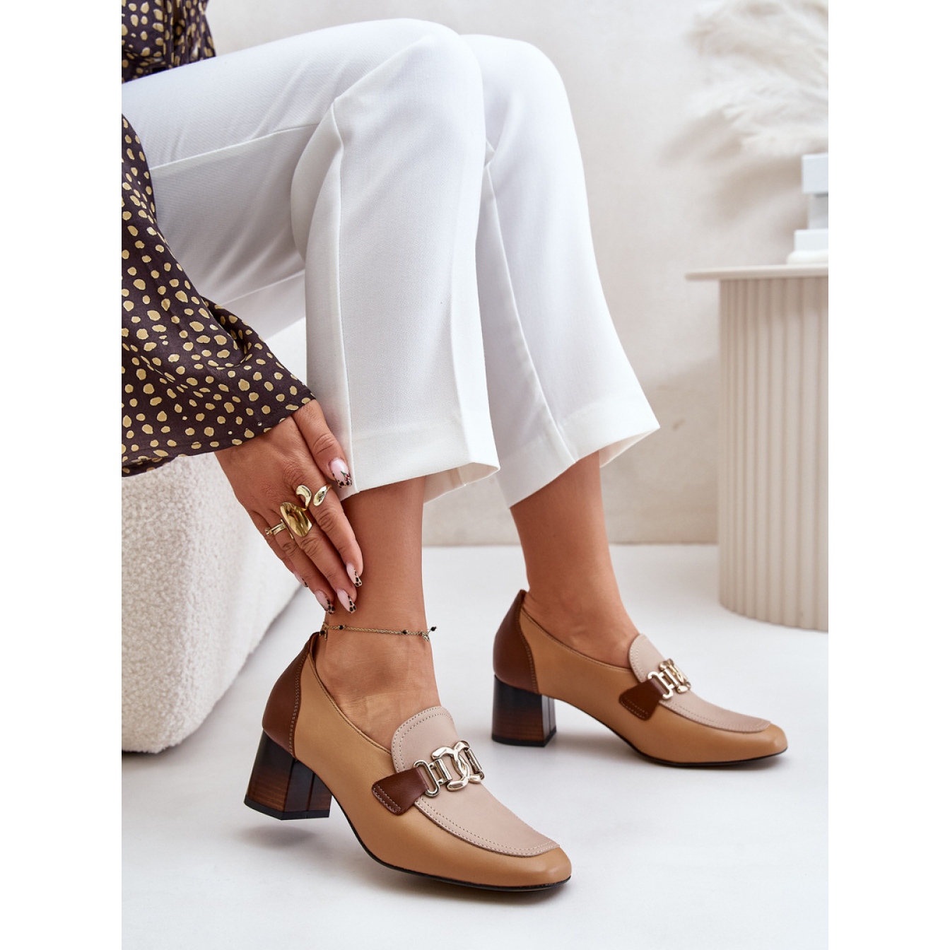 Čerpadla jsou charakterizována patou ve formě 5,5 cm vysokého sloupku, díky čemuž jsou dokonale kombinují eleganci s pohodlím. Čtvercové nosy jim dávají moderní vzhled a Zlatá dekorace na frontě přidává jedinečné kouzlo a zdůrazňuje jejich jedinečný design.