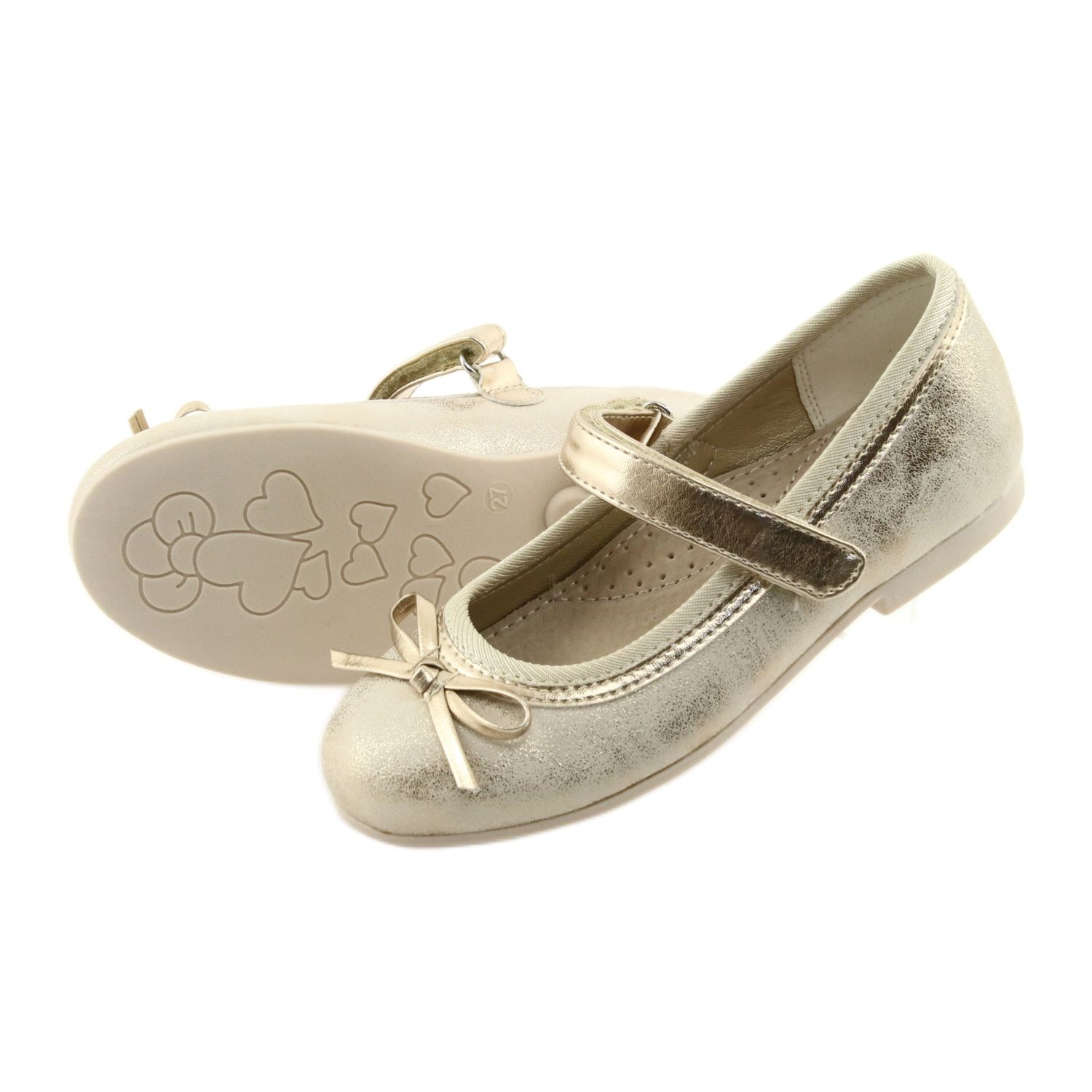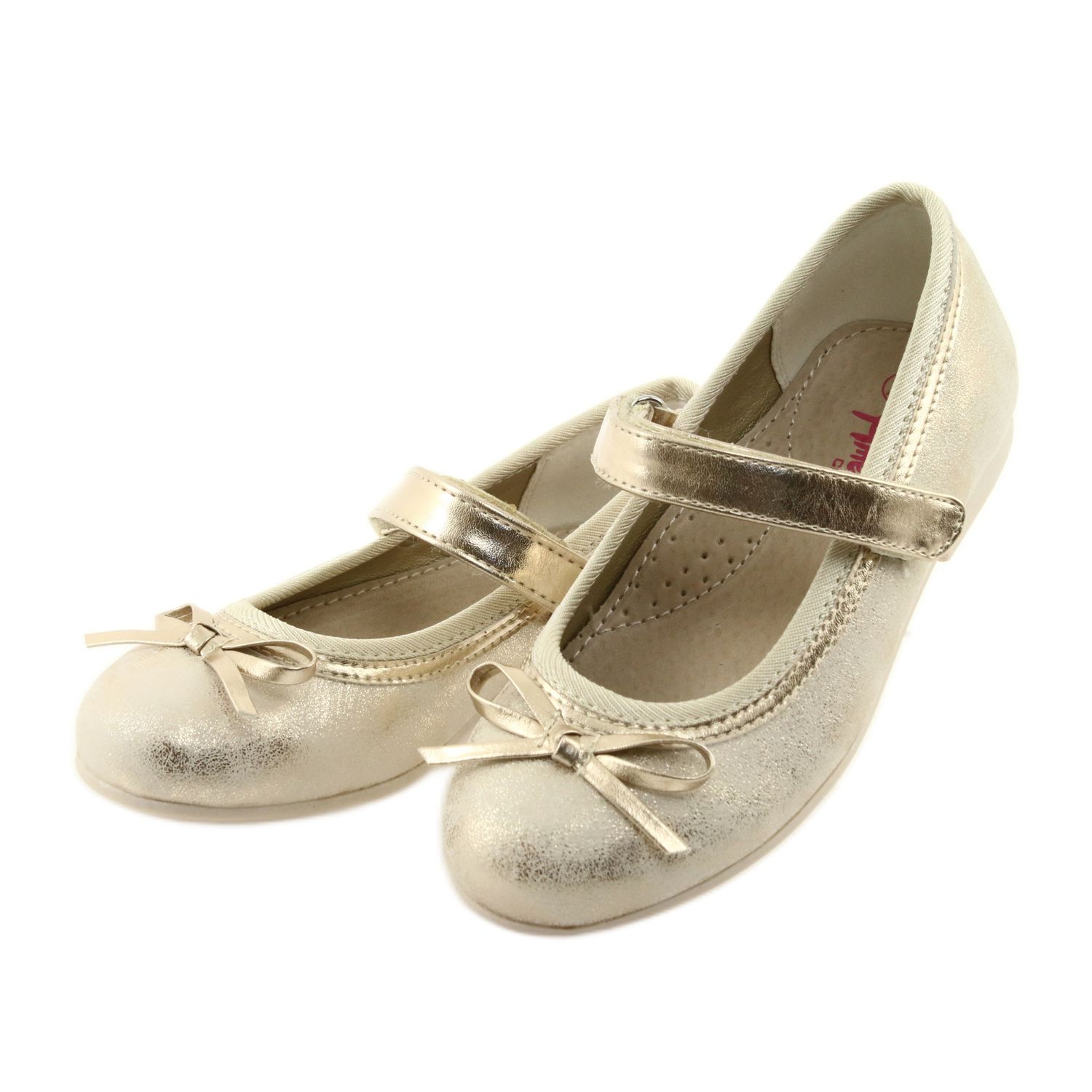 Balerínové lodičky American Club GC18 s mašlí jsou perfektní volbou pro malé elegantní slečny! Tyto boty vyrobené z ekokůže v krásné pozlacené béžové barvě s dodatečným akcentem v podobě zlaté mašle spojují styl a pohodlí.