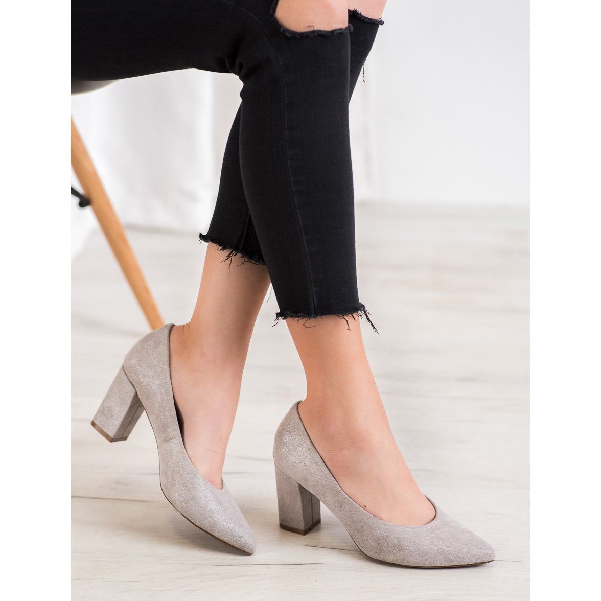 Lodičky W. Potocki s šedými třpytkami jsou perfektní volbou pro ženy, které chtějí spojit eleganci s jedinečným stylem. Tyto krásné boty vyrobené z vysoce kvalitní imitace semiše potěší svým nadčasovým designem, který se bude hodit jak pro každodenní nošení, tak pro speciální příležitosti.