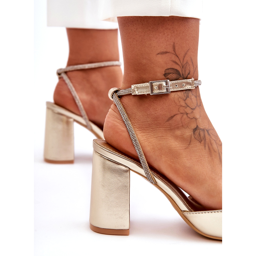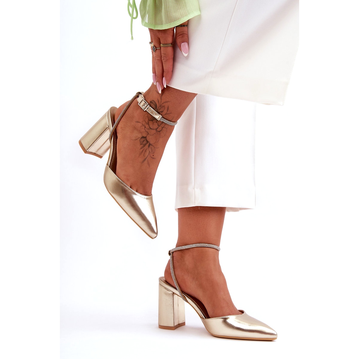 Elegantní Lyros čerpadla v kovovém odstínu zlata - kombinace stylu a pohodlí. Vyrobeno z ekologického pokoje, namontované na stabilní patě ve formě sloupku (výška 8,5 cm), s charakteristickým nosem v Spitz. Jemný popruh zdobený kamínky napodobujícími kamínky a upevňovací spony přidávají eleganci a jedinečnou záři. Měkká ekologická vložka zajišťuje pohodlí i během delšího nošení.